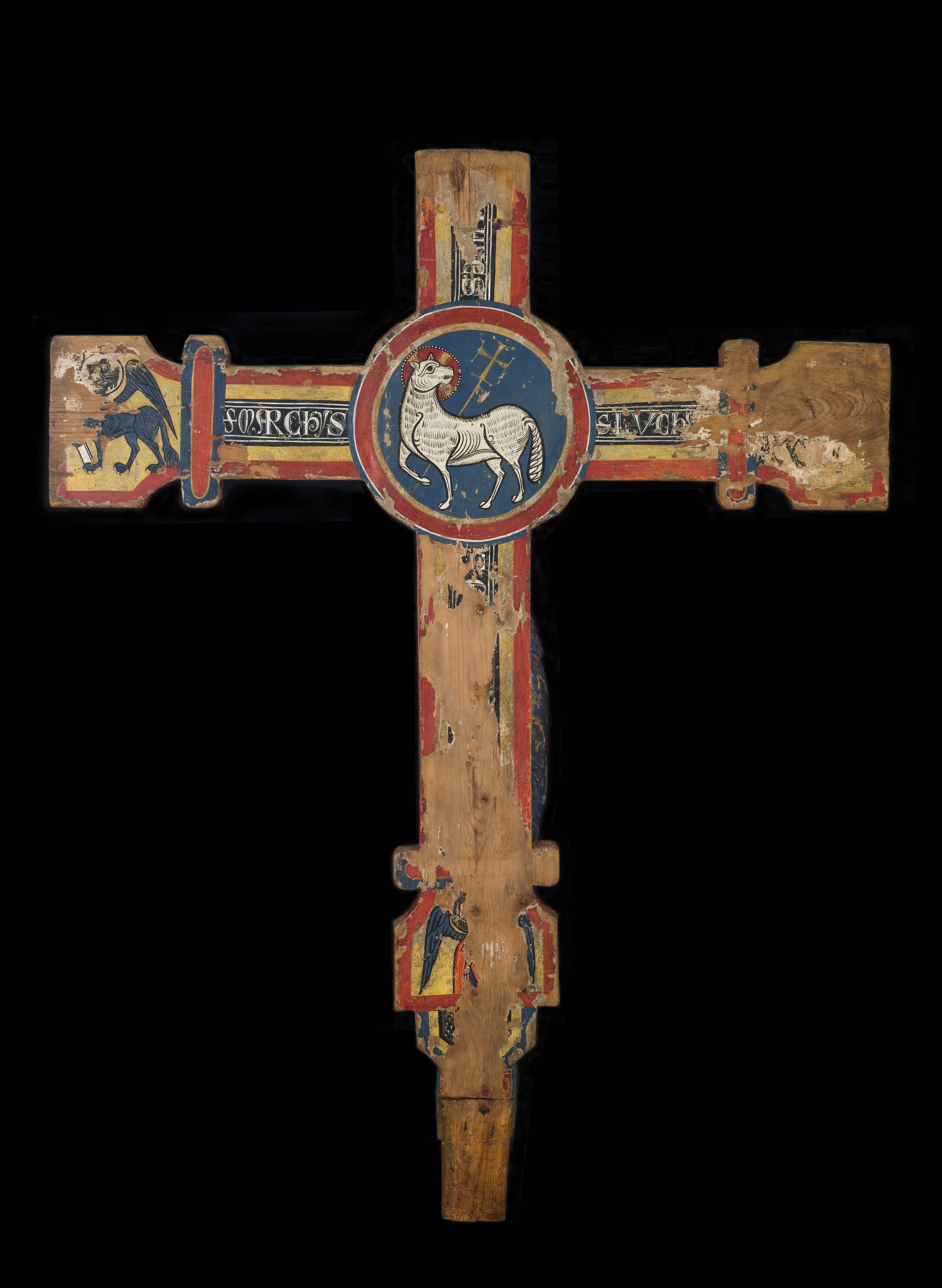 La creu, amb unes mides de 140 cm d’alçada per 116 cm d’amplada, també està feta de fusta policromada. Presenta ambdues cares decorades de manera molt desigual: l’anvers té una decoració floral feta amb relleus de pasta i el dors és policromat amb la simbologia típica d’aquestes creus.