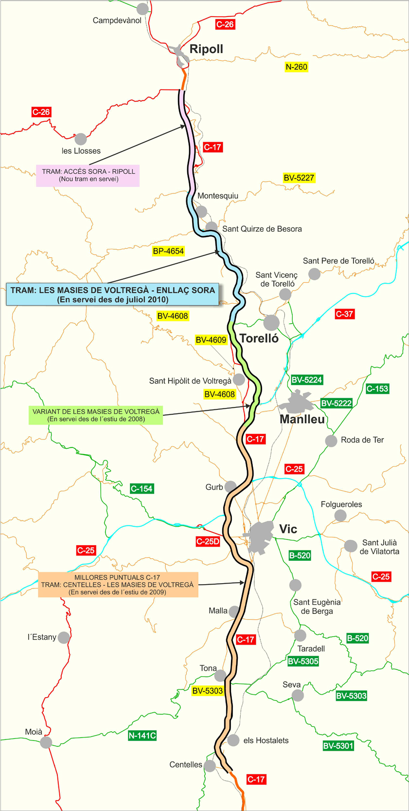 Finalment, cal indicar que el Departament de Territori i Sostenibilitat està redactant el projecte constructiu per al condicionament del tram de la C-17 més proper al nucli urbà de Ripoll, en una longitud d’1,8 quilòmetres. Aquest tram discorre entre la carretera de les Llosses i la rotonda d’accés a Ripoll que, ateses les seves característiques més urbanes, s’ha tractat específicament, tot separant-lo del desdoblament que ara finalitza. L’obra comportarà una inversió estimada en 6 MEUR i es preveu iniciar la seva execució l’any vinent.