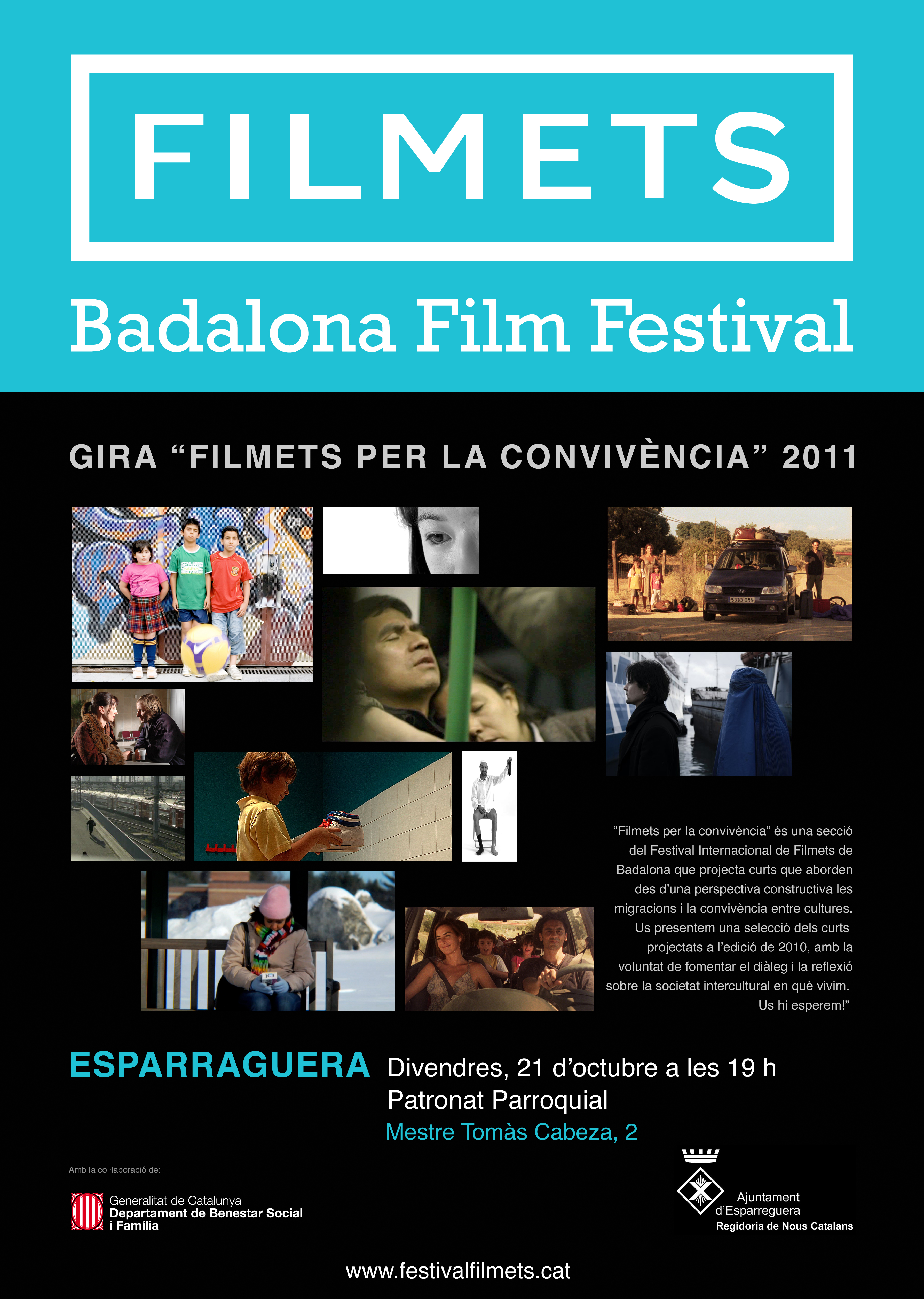 El Patronat Parroquial d’Esparreguera (C/ Mestre Tomàs Cabeza, 2) acollirà aquest divendres 21 d’octubre a les 19 hores i en sessió oberta a tothom la gira de curtmetratges “Filmets per la convivència” 2011, que organitza el Festival Internacional de Filmets de Badalona i la Direcció General per a la Immigració del Departament de Benestar Social i Família, amb la col·laboració de la regidoria de Nous Catalans de l’Ajuntament.