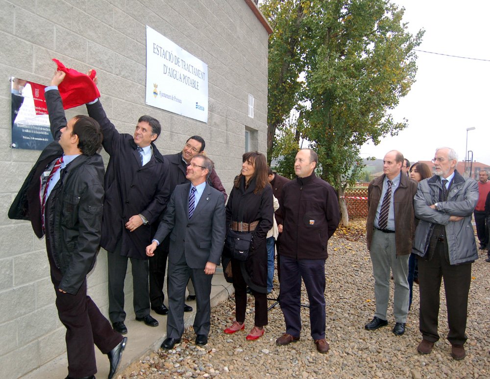 El conseller de Territori i Sostenibilitat, Lluís Recoder, l’alcalde de Preixana, Jaume Pané, i el director de l’Agència Catalana de l’Aigua, Leonard Carcolé, juntament amb diverses autoritats locals i provincials, han posat oficialment en servei aquesta infraestructura