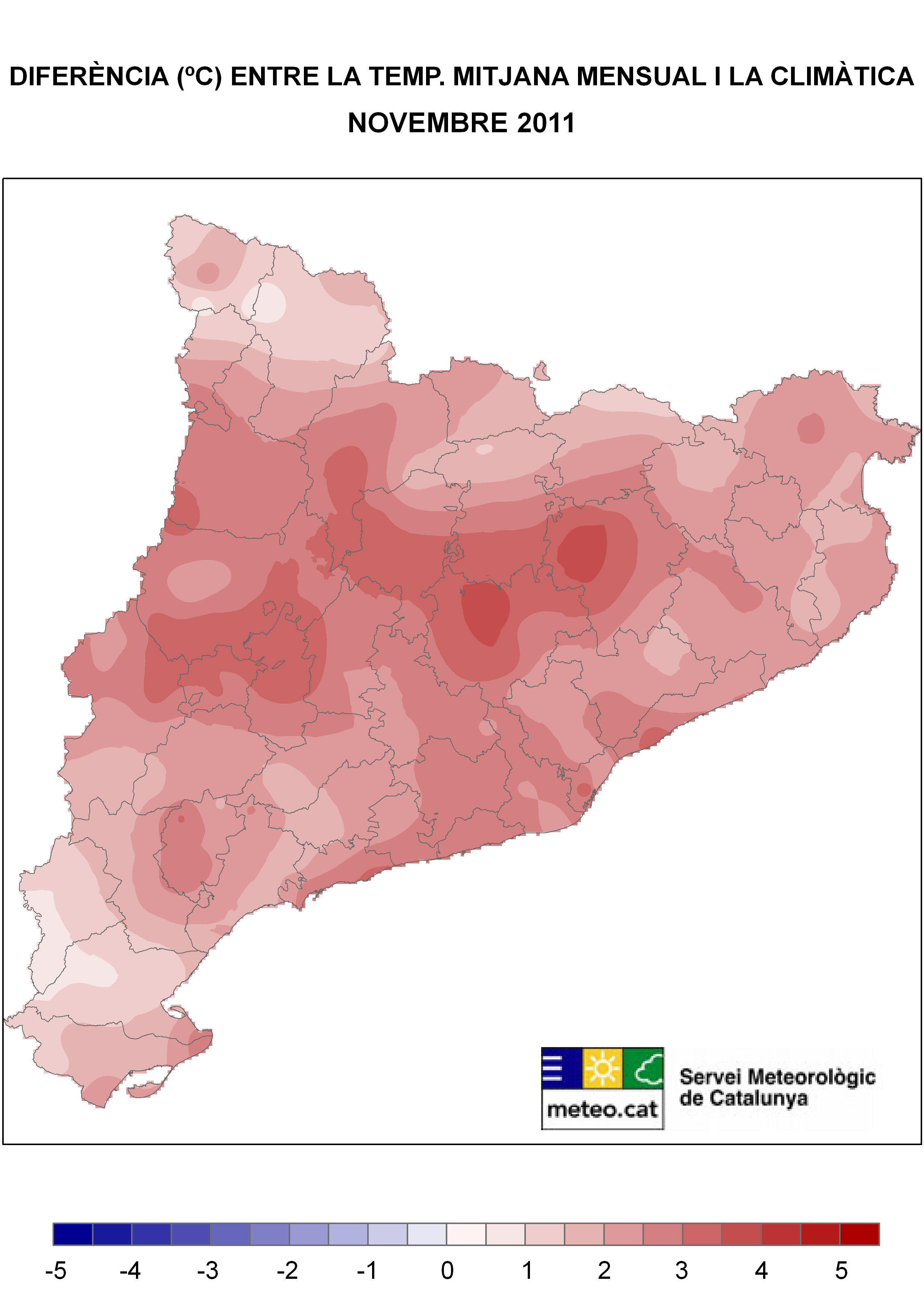 Mapes de temperatura mitjana del mes de novembre de 2011 i de diferència d’aquesta respecte de la mitjana climàtica