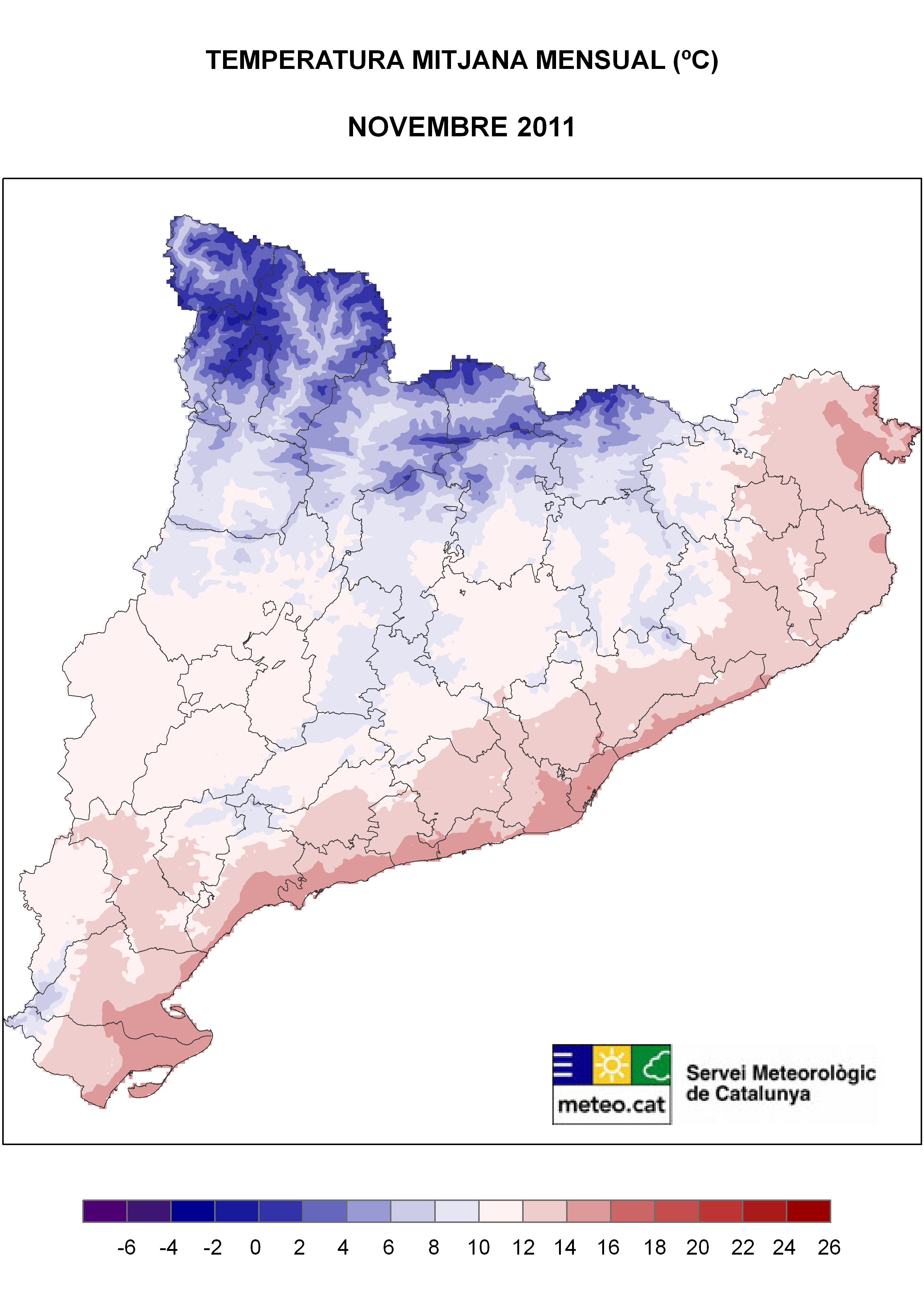 Pel que fa a la temperatura, el mes de novembre ha estat càlid a gran part del país, i fins i tot molt càlid a gran part del Prepirineu, l’Altiplà Central, la Catalunya Central i punts de la comarca del Segrià. Aquesta situació ha estat deguda pels fluxos del sud i de l’est que han acompanyat a les pertorbacions que han afectat el país i que arrossegaven masses d’aire relativament càlides procedents de baixes latituds. Malgrat l’abundant nuvolositat que ha afectat el país durant gran part del mes, mantenint la temperatura màxima en uns valors dins de la normalitat, aquests fluxos càlids del segon i tercer quadrant no han permès una baixada eficient dels valors nocturns i, per tant, la temperatura mínima ha estat molt per sobre dels valors que s’esperen normals per a l’època de l’any.