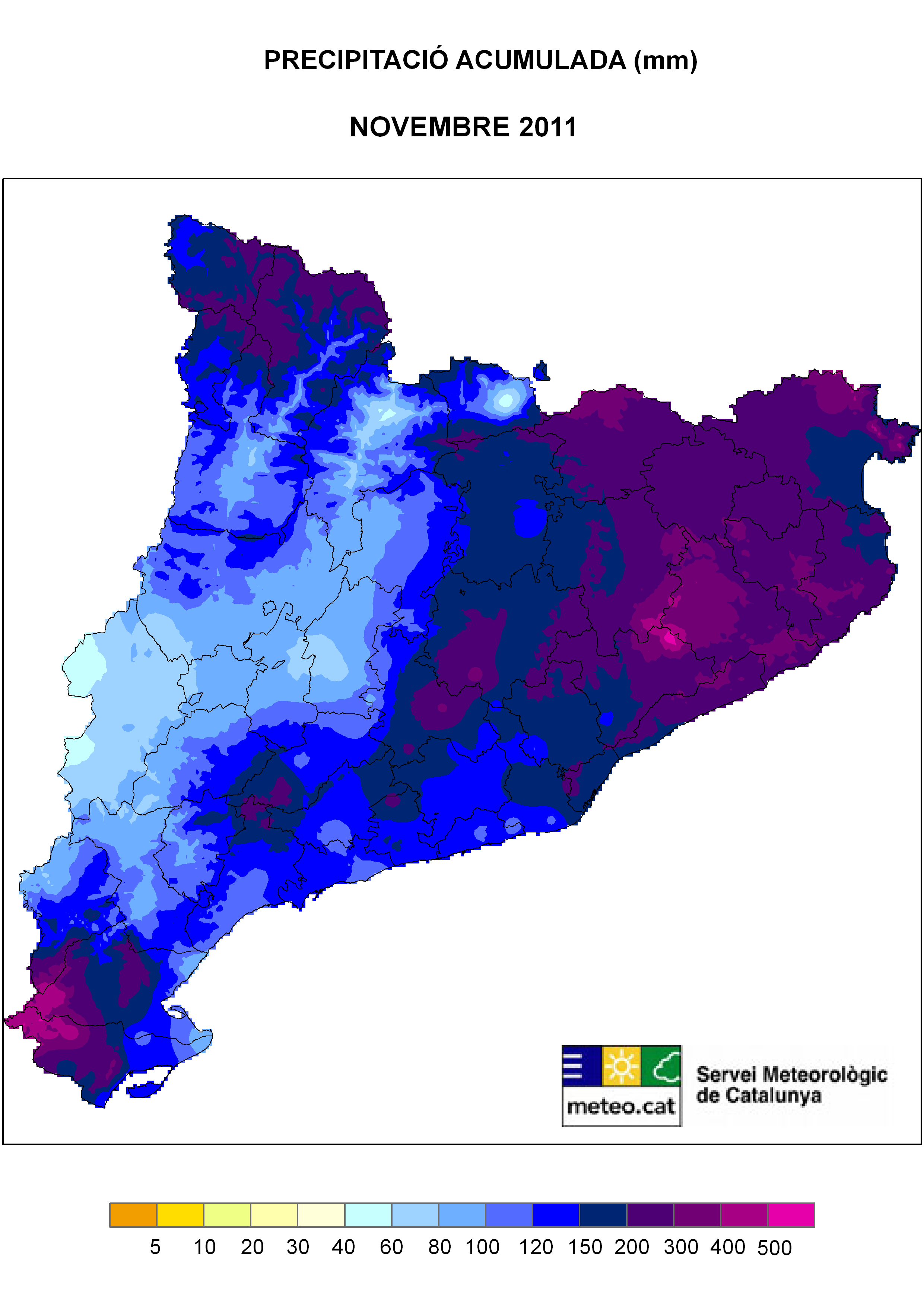 Pluviomètricament, el novembre ha estat molt plujós a gran part del país, si bé s’ha de qualificar com a plujós al Pirineu i Prepirineu Occidental, el delta de l’Ebre, extrem més occidental de les comarques del Segrià i de la Terra Alta, punts del litoral i prelitoral sud i de la serra del Garraf. El novembre ha estat normal a la vall superior del riu Segre.