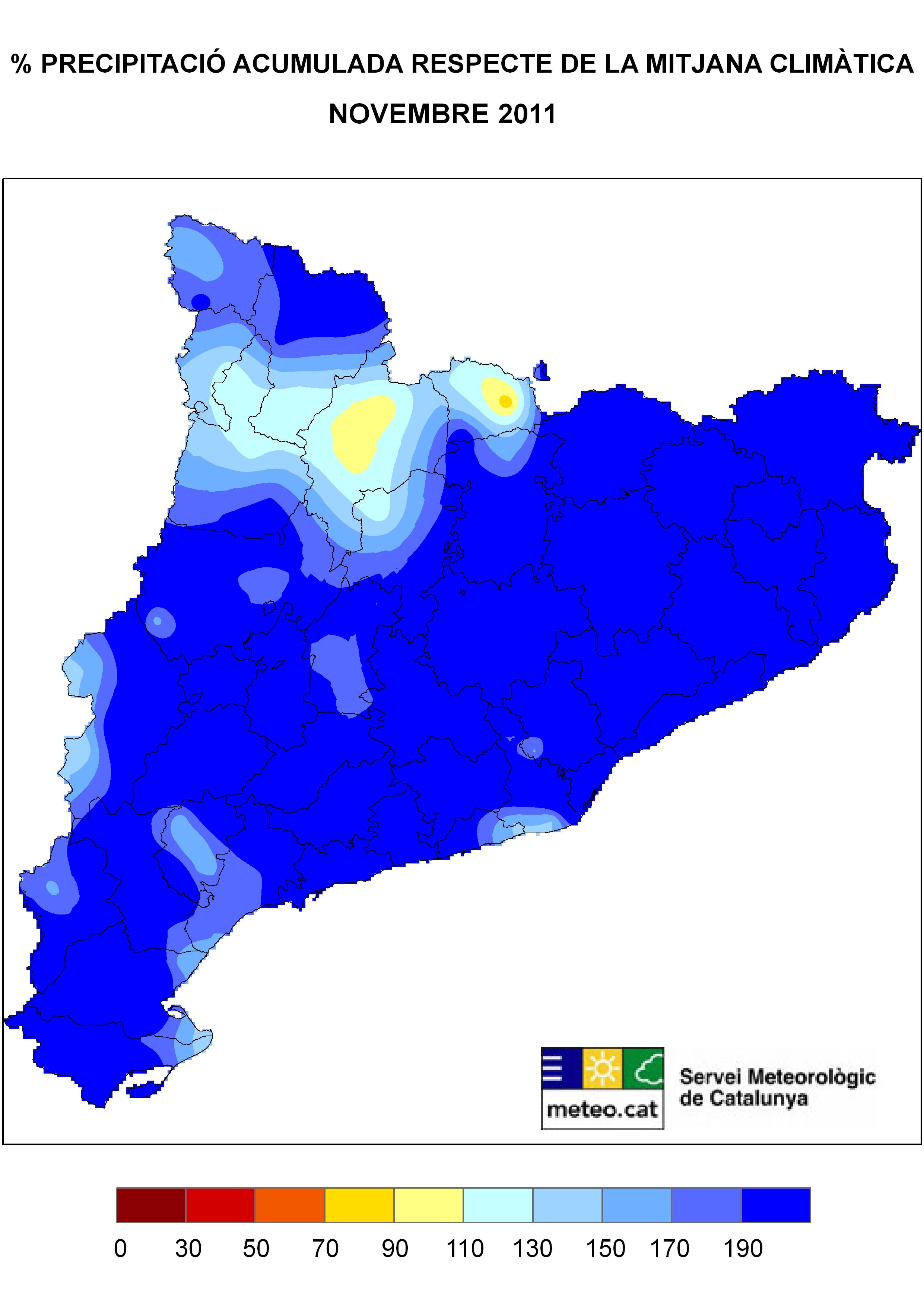 La meteorologia del mes de novembre de 2011 ha vingut marcada d’una banda, per tres pertorbacions molt actives que van deixar precipitacions importants a gran part de Catalunya, especialment a la meitat est i, d’altra, pels fluxos del segon i tercer quadrant que les acompanyaven que no van permetre una baixada de la temperatura. D’aquesta manera, cal remuntar-se a l’any 1983 per a trobar un novembre més plujós a la meitat est del territori, mentre que si bé el novembre d’enguany ha estat un del més càlids de les darreres dècades, no ha superat els rècords de temperatura mitjana que es van assolir l’any 2006.