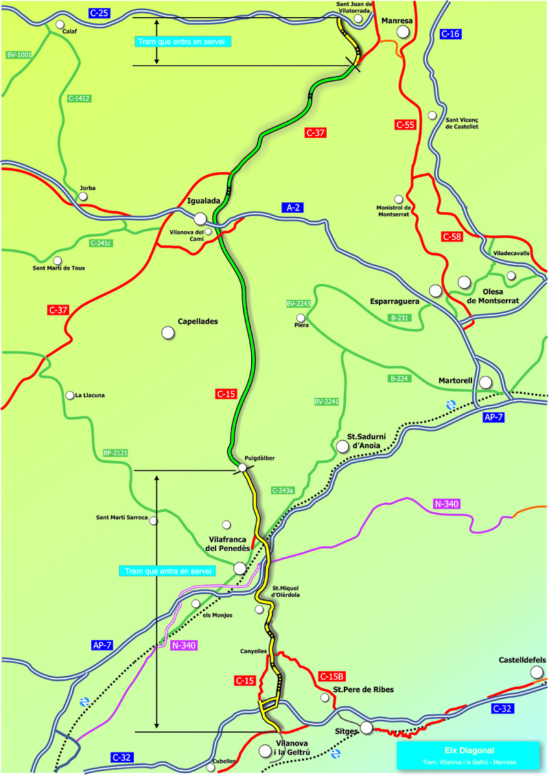 Avui, els trams que entren en servei i que culminen l’Eix Diagonal corresponen als extrems de l’actuació i són totalment de nova construcció. Sumen una longitud total de 28 quilòmetres, 13 dels quals tenen les característiques d’autovia. En concret, són els trams Vilanova i la Geltrú - Vilafranca del Penedès, Vilafranca del Penedès – Font-rubí i Sant Salvador de Guardiola – Manresa. Així, l’Eix Diagonal ha entrat en funcionament uns set mesos abans de l’inicialment previst.