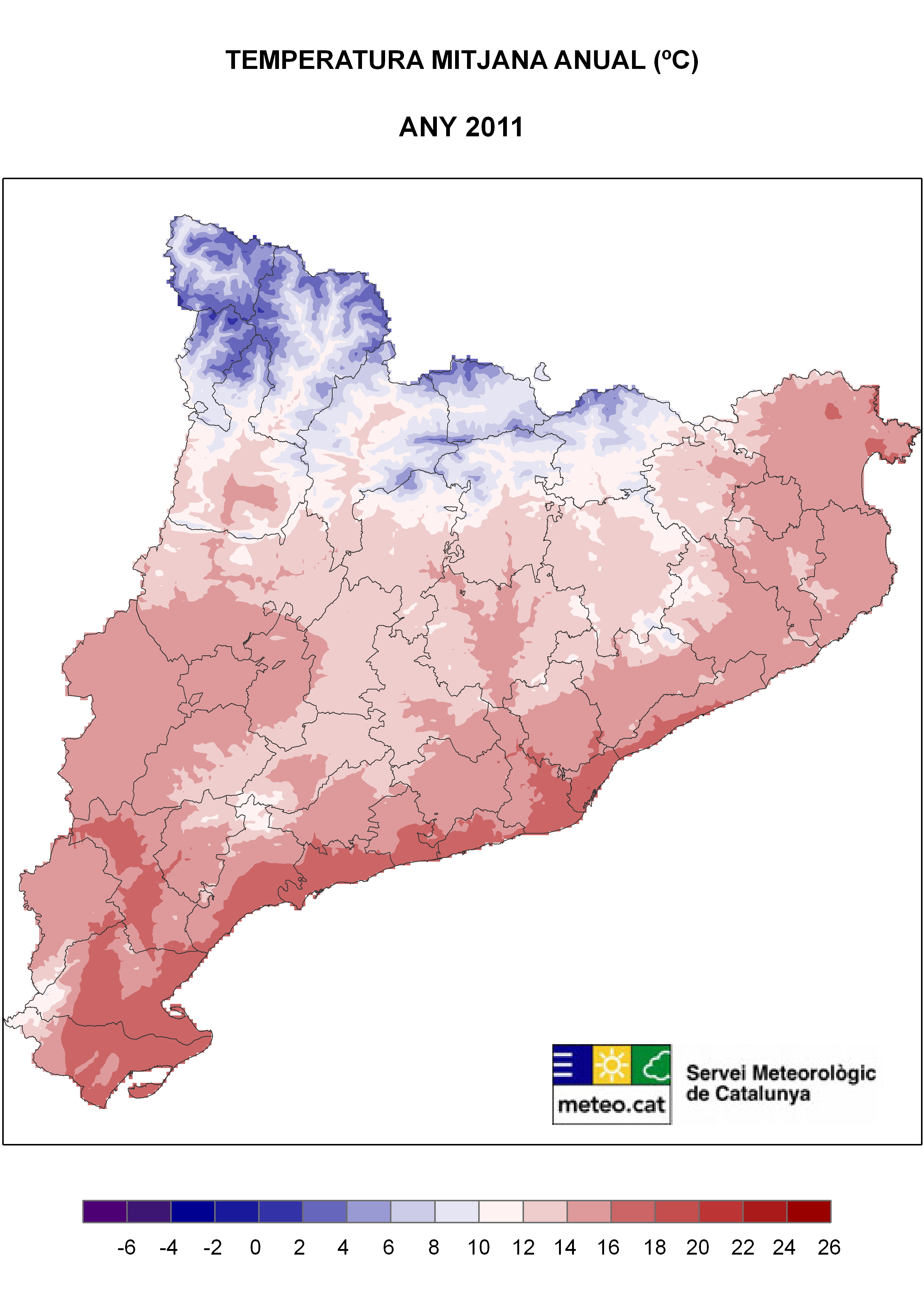 Respecte la mitjana climàtica del període 1961-90, l’anomalia de temperatura de l’any 2011 s’ha situat entre +0,5 i +1,5 ºC a la majoria de comarques, de manera que cal parlar d’un any càlid en conjunt.
