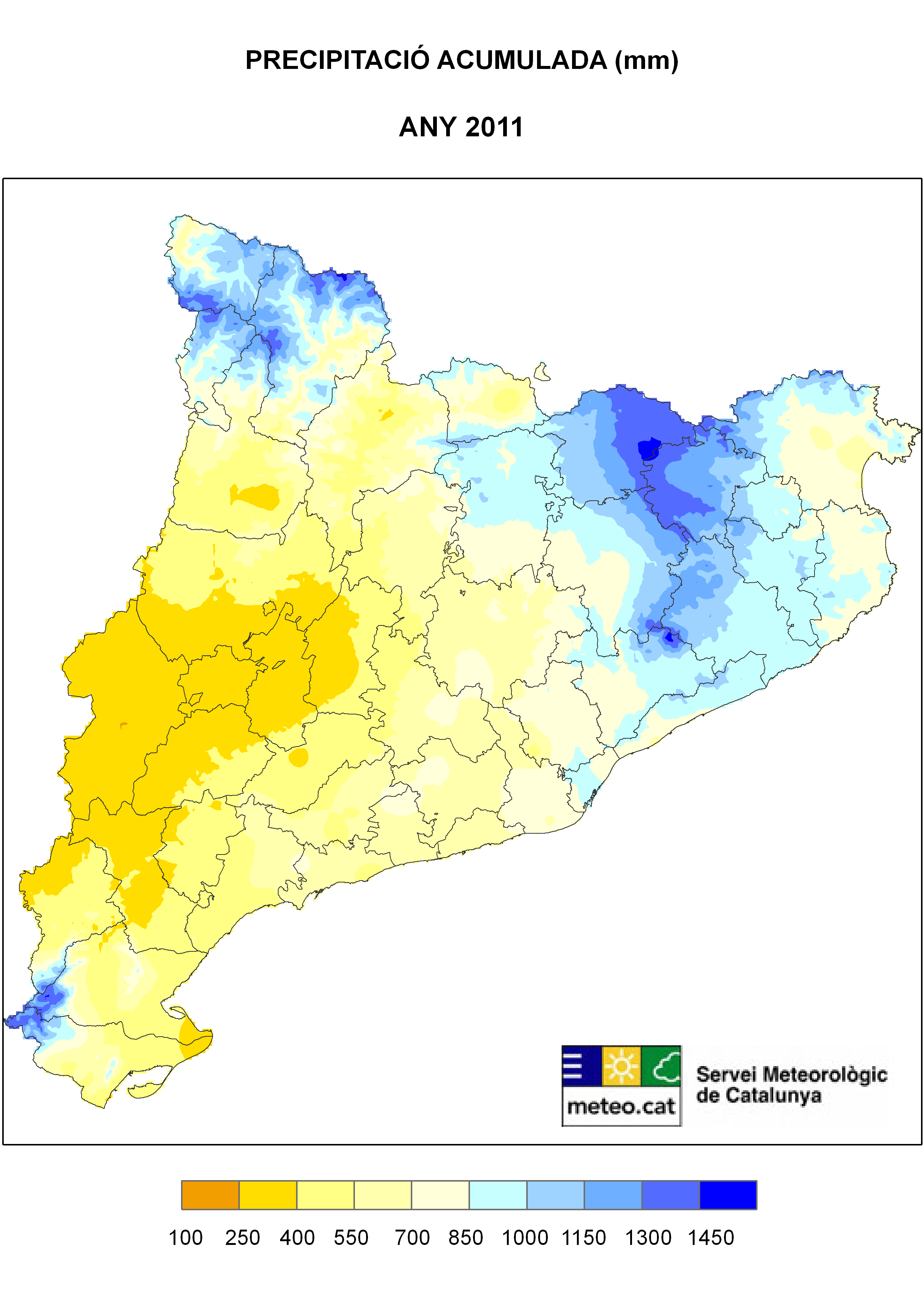 La quantitat de precipitació que s’ha acumulat al llarg del 2011 mostra la gran irregularitat espacial de la pluviometria a Catalunya. Les quantitats més extremes cal situar-les a les zones més baixes del pla de Lleida, on s’han acumulat entre 250 i 300 mm, mentre que s’han superat els 1.400 mm en punts de la Vall de Camprodon (el Ripollès), de la Vall d’en Bas (la Garrotxa), als cims del Montseny i a les cotes més altes del Pallars Sobirà i la Val d’Aran.