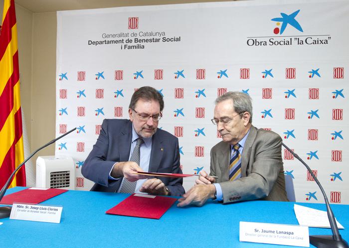 El conseller de Benestar Social i Família, Josep Lluís Cleries, i el director general de la Fundació “la Caixa”, Jaume Lanaspa, han signat aquest matí al Casal de gent gran Bac de Roda de Barcelona la renovació del conveni del programa gent 3.0.
