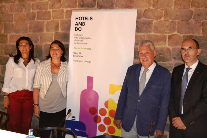 El director de l’Institut Català de la Vinya i el Vi (INCAVI), Jordi Bort, i el president del Gremi d’Hotels de Barcelona, Jordi Clos; acompanyats de la tinent d’Alcalde d’Economia, Empresa i Ocupació de l’Ajuntament de Barcelona, Sònia Recasens; i de la directora general de turisme, Marian Muro; han presentat avui la segona edició d’”HOTELS AMB D.O.”, una iniciativa pionera a Catalunya.