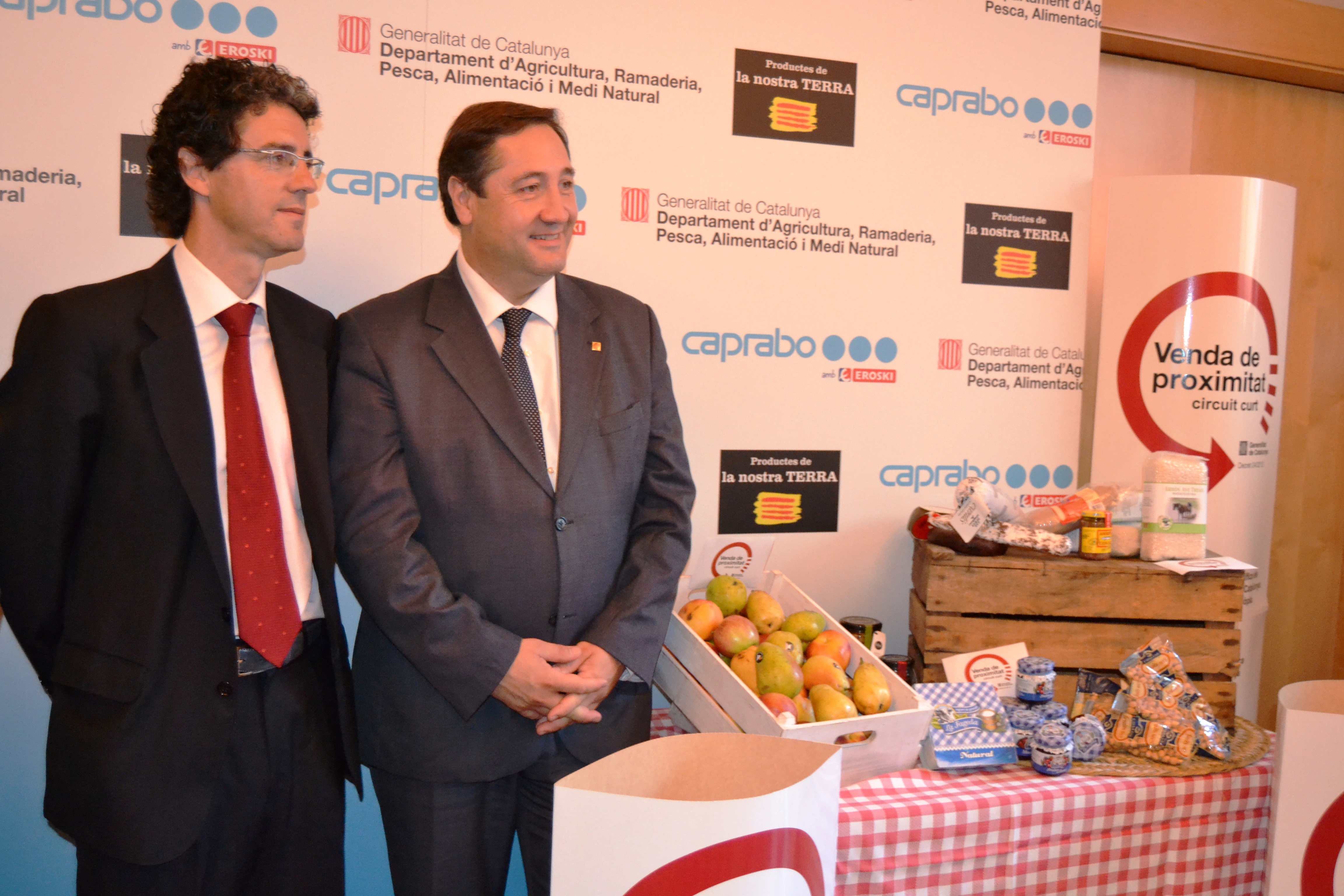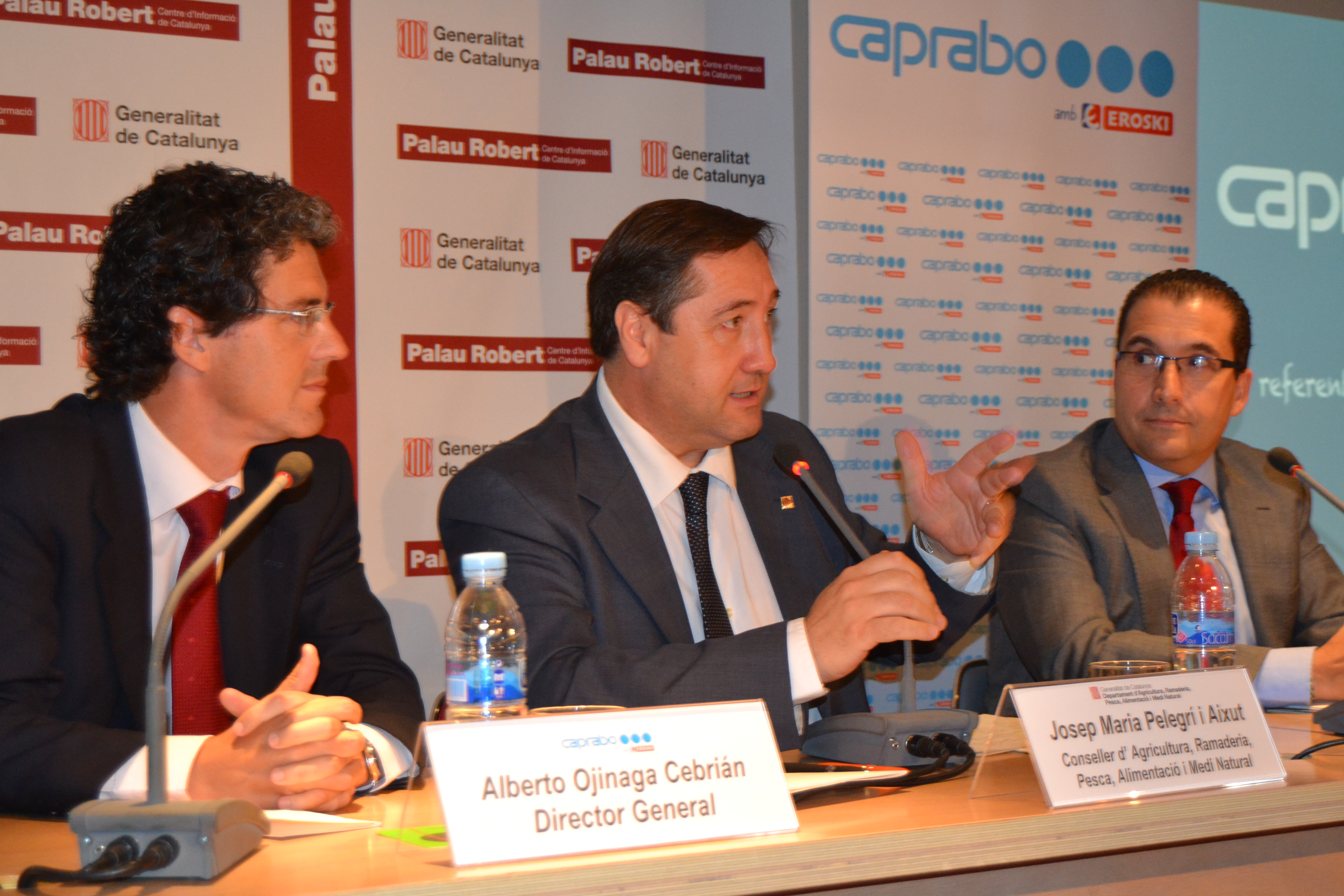 El conseller d’Agricultura, Ramaderia, Pesca, Alimentació i Medi Natural, Josep Maria Pelegrí, juntament amb el director general de Caprabo, Alberto Ojinaga, han presentat avui, a Barcelona, la campanya de promoció de productes catalans als supermercats Caprabo, en un acte que també ha comptat amb la presència del director general d’Alimentació, Qualitat i Indústries Agroalimentàries, Domènec Vila, així com dels directors dels Serveis Territorials del Departament a Barcelona i a Girona, Marià Morera i Vicenç Estanyol, respectivament, i del director comercial de Caprabo, Josep Barceló.