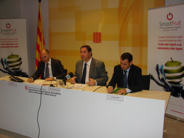 El conseller d’Agricultura, Ramaderia, Pesca, Alimentació i Medi Natural, Josep Maria Pelegrí, acompanyat del director general d’Agricultura i Ramaderia, Miquel Molins, i del conseller delegat de l’empresa pública Promotora d’Exportacions Catalanes (PRODECA) i director general de l’Institut Català de la Vinya i el Vi (INCAVI), Jordi Bort, així com del director dels Serveis Territorials del Departament a Lleida, Jaume Fabà, ha presentat avui, a Lleida, el SmartFruit IPM International Congress, que se celebrarà a Barcelona, del 2 al 4 de febrer.