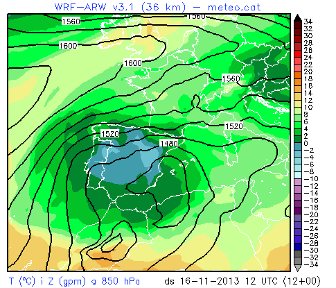 El mapa següent mostra la topografia i la temperatura de 850 hPa (uns 1.500 metres d’altura) corresponent al dissabte 16 de novembre a les 12 UTC. S’hi pot veure la depressió perfectament formada al voltant de les Balears, impulsant vent de llevant sobre el litoral català. El mapa mostra un contrast de temperatura molt marcat entre els dos extrems del país, amb valors de l’ordre de -2ºC a les Terres de l’Ebre i de +4ºC a les comarques gironines. Aquest fet explica que la cota de neu fos molt més baixa a l’extrem sud, on la neu va agafar fins a cotes de 300 metres, que no pas al nord-est del país, on es va situar ràpidament al voltant dels 1.600 o 1.700 metres.