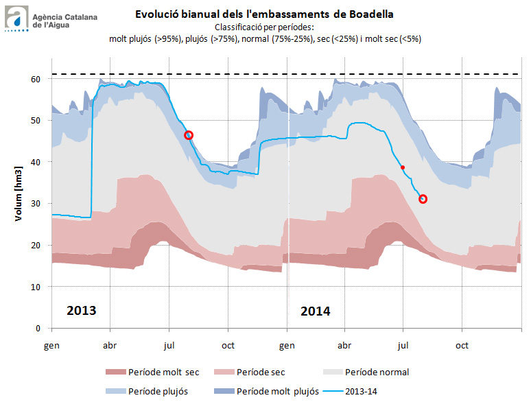 L’embassament de Boadella, per la seva banda, se situa al 51% de la seva capacitat (31 hm3), 29 punts menys que fa un any, quan disposava de 49 hm3. Aquest descens, seguint la tendència registrada en altres estius, es deu, per una banda, a l’increment de la demanda estival (abastament domèstic i campanya de reg), i a les escasses pluges registrades a la capçalera del riu Muga.