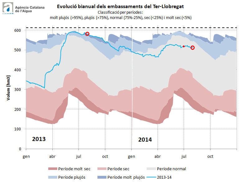El sistema Ter-Llobregat se situa al 84% de la seva capacitat (511 hm3), 11 punts menys que fa un any, quan emmagatzemava 580 hm3 (95%). Amb aquest nivell de reserves es constata en aquest sistema una estabilització de les seves reserves en els darrers dos mesos, fruit de les tempestes que s’han registrat a la capçalera dels seus rius.