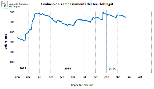 El sistema Ter-Llobregat se situa actualment al 89% de la seva capacitat (546 hm3), 3 punts i 22 hm3 més que fa un any. Els embassaments del Ter (Sau i Susqueda) estan al 90% (359 hm3), sis punts i 25 hm3 més que fa un any, mentre que els del Llobregat (la Baells, la Llosa del Cavall i Sant Ponç) se situen al 89% (546 hm3), 3 punts i 22 hm3 més que fa un any.
