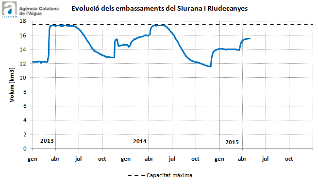 El sistema Siurana-Riudecanyes, per contra, disposa de menys reserves que l’any passat. Actualment es troba al 87%, amb més de 15 hm3 emmagatzemats, mentre que fa un any se situava al 99% amb més de 17 hm3. Les demandes d’aquest sistema són l’abastament domèstic i els usos agrícoles.