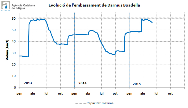 L’embassament de Darnius Boadella (Alt Empordà) avui està al 92%, amb 56 hm3 emmagatzemats. Tot i que en el darrer mes ha registrat un lleu descens de reserves, està en millor situació que fa un any, quan es situava al 78% amb 47 hm3. Les principals demandes d’aquest embassament per als propers mesos són l’abastament domèstic, els usos agrícoles (la campanya de reg s’acostuma a satisfer durant els mesos d’estiu) i el cabal ambiental del riu la Muga.