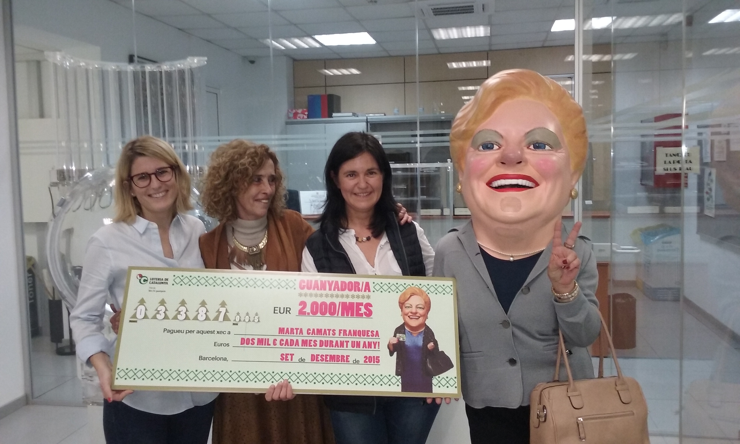 La secretària d’Hisenda, Elsa Artadi, ha lliurat avui el premi extraordinari de 2.000 euros al mes durant tot un any a Marta Camats, veïna de Sant Cugat. La senyora Camats va participar quatre vegades per correu electrònic i també via Facebook, amb quatre bitllets diferents, i la fotografia guanyadora ha estat la que va fer arribar per correu el passat 11 de novembre, amb el número 03387 sèrie 005, adquirit a l’estanc 173 de Barcelona. L’acte de lliurament ha tingut lloc aquesta tarda i ha comptat amb la presència de la propietària de l’estanc, Maria del Mar Güell, que va repartir la sort.