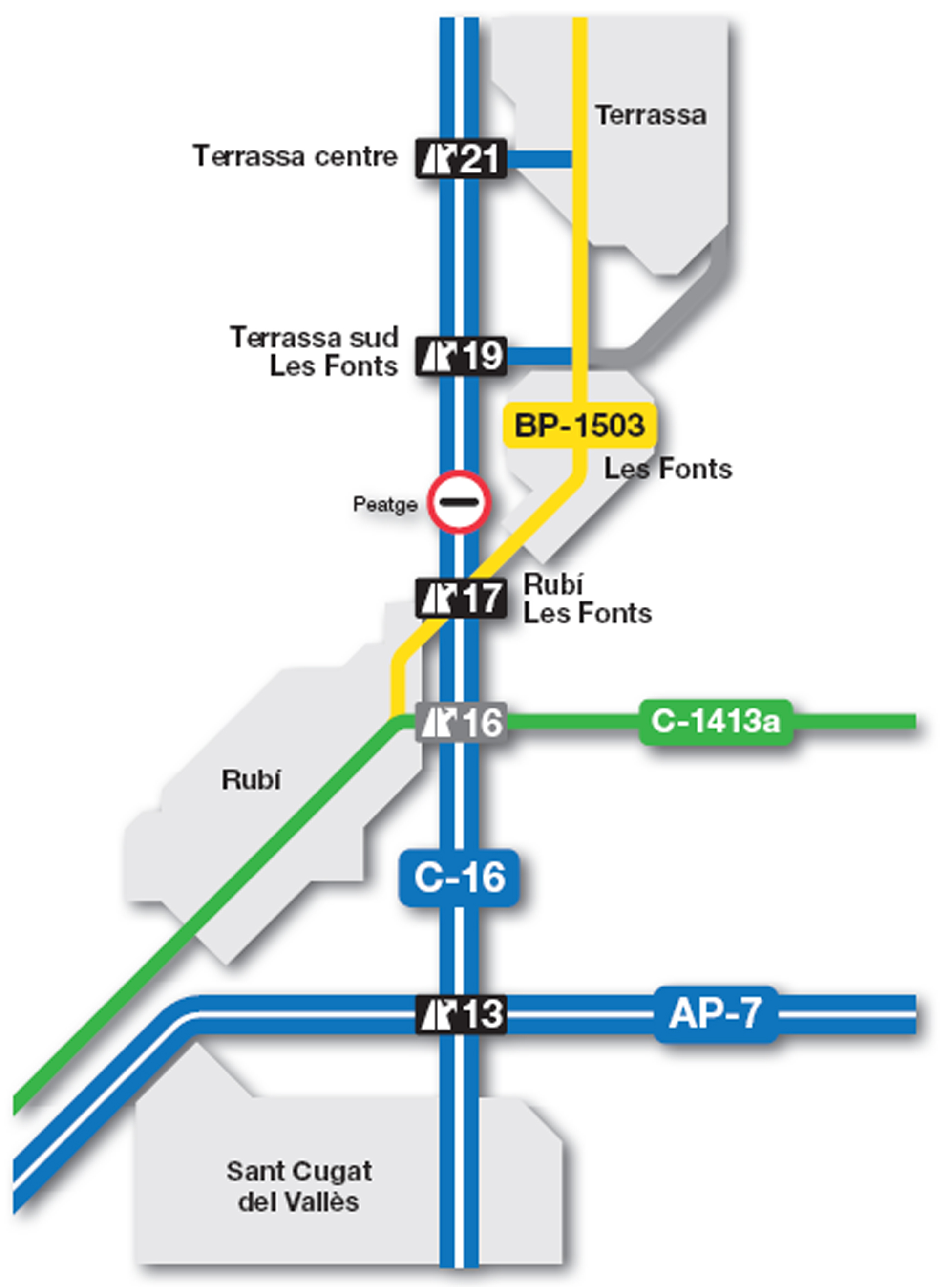 - Al tram de la C-16 entre Terrassa i Sant Cugat s’aplicarà a més el sistema de peatge tancat tots els dies de la setmana, amb reduccions de fins al 70% segons el recorregut