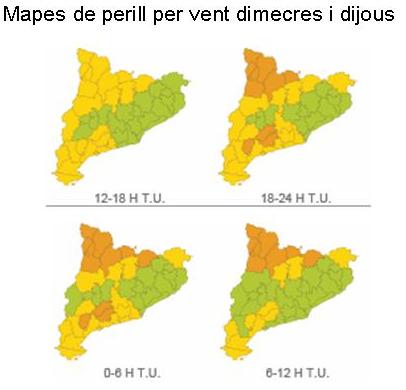 Segons les previsions de l’SMC, avui el vent podrà superar ratxes de 90 km/h al Pirineu, Prepirineu, comarques de Tarragona i Terres de l’Ebre, Anoia, Alt Penedès, Garraf i Baix Llobregat. El vent es reforçarà a partir d’aquest vespre i fins demà al matí i podrà afectar sobretot les comarques de l’Alt Camp, Priorat i la Conca del Barberà. A partir del migdia de demà el vent es restringirà a les cotes altes del Pirineu. Les ratxes més fortes de vent s’esperen durant la propera nit i matinada.
