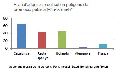D’altra banda, Catalunya té un preu de compra del sòl molt més elevat que el d’altres països europeus. Aquest cost encareix posteriorment el preu de venda del sòl ja urbanitzat destinat a habitatge o a activitat econòmica.