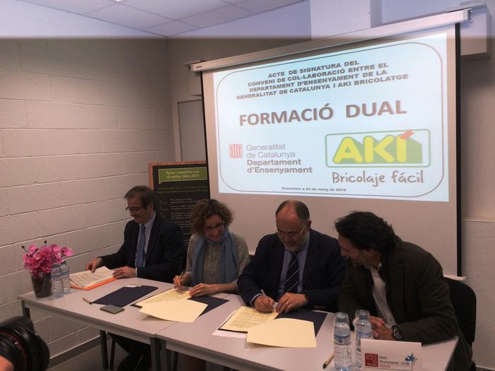 La consellera ha signat el conveni conjuntament amb el director regional d’AKÍ Bricolaje España, Onofre Burgos. A la signatura, que ha tingut lloc aquesta tarda a la botiga d’AKÍ de Granollers, també hi han assistit el director general de Formació Professional Inicial i Ensenyaments de Règim Especial, Melcior Arcarons i la directora dels Serveis Territorials del Maresme-Vallès Oriental, Carmina Pinya.