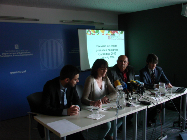 Les previsions de collita de fruita de pinyol indiquen un descens del 12 per cent en el conjunt de Catalunya respecte a les de l’any passat, segons les dades que s’han presentat aquesta matí, a la seu del Departament a Lleida, per part de la directora general d’Agricultura i Ramaderia del Departament d’Agricultura, Ramaderia, Pesca i Alimentació (DARP) de la Generalitat de Catalunya, Teresa Masjuan, acompanyada del director dels Serveis Territorials del Departament a Lleida, Ferran de Noguera, juntament amb el director general de l’Associació empresarial de la fruita de Catalunya (Afrucat), Manel Simon, i el president del Comitè de Pinyol d’Afrucat, Francesc Palau.