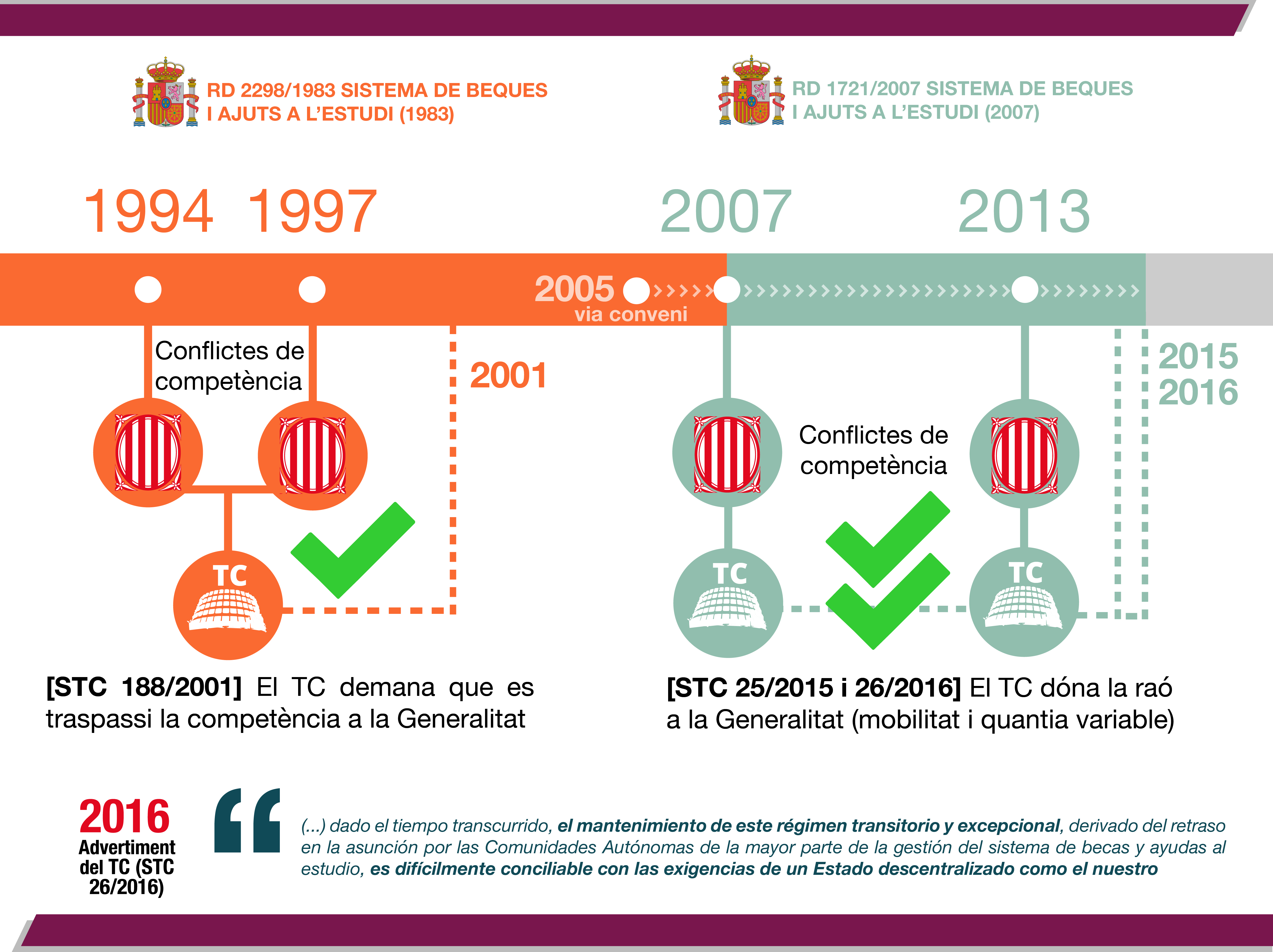 La sentència, però, també adverteix l’Estat que la fórmula dels convenis de col·laboració anuals no és correcta ja que es tracta d’una fórmula provisional, a l’espera de fer efectiva la transferència de la competència. Concretament, el text del tribunal subratlla que “donat el temps transcorregut, el manteniment d’aquest règim transitori i excepcional, derivat del retard en l’assumpció per les Comunitats Autònomes de la major part de la gestió del sistema de beques i ajuts a l’estudi, és difícilment conciliable amb les exigències d’un Estat descentralitzat com el nostre”.