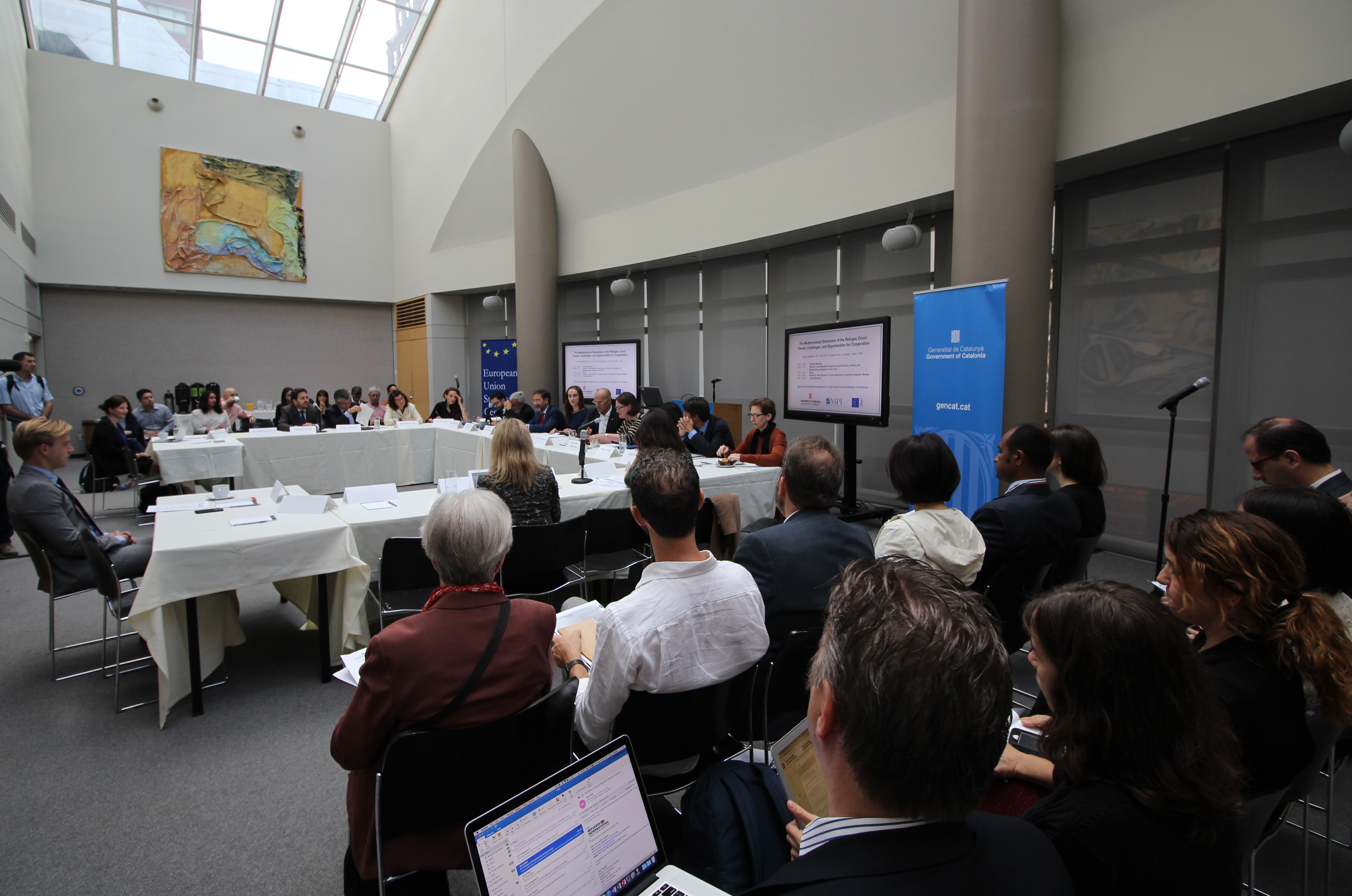 La segona ponència ha tingut lloc avui divendres al matí a la City University of York (CUNY), on el conseller ha donat la benvinguda als assistents -juntament amb Patrizia Nobbe, directora del Centre d’Estudis Europeus de la CUNY-, i ha introduït un panell de discussió sobre la dimensió mediterrània de la crisi dels refugiats.