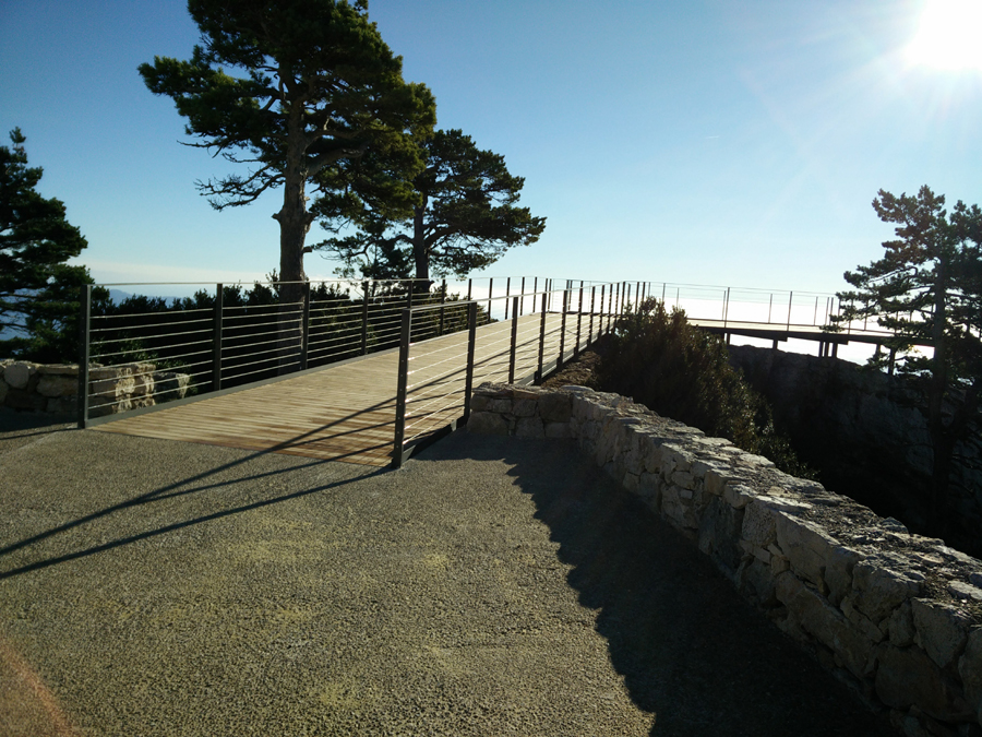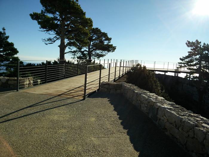 S’ha construït una passarel·la i una plataforma de fusta de 70 m2, elevada sobre l’orografia originària del cim. S’ha pavimentat l’accés per a vianants des de la zona d’estacionament fins al mirador i s’ha habilitat una plaça d’estacionament per a persones amb mobilitat reduïda a la vora del mirador. La plaça que dona accés al monument de la Verge de la Cinta ha quedat eixamplada i s’han refet les escales i els murs perimetrals. També s’hi ha col·locat senyalització interpretativa adaptada per a invidents.