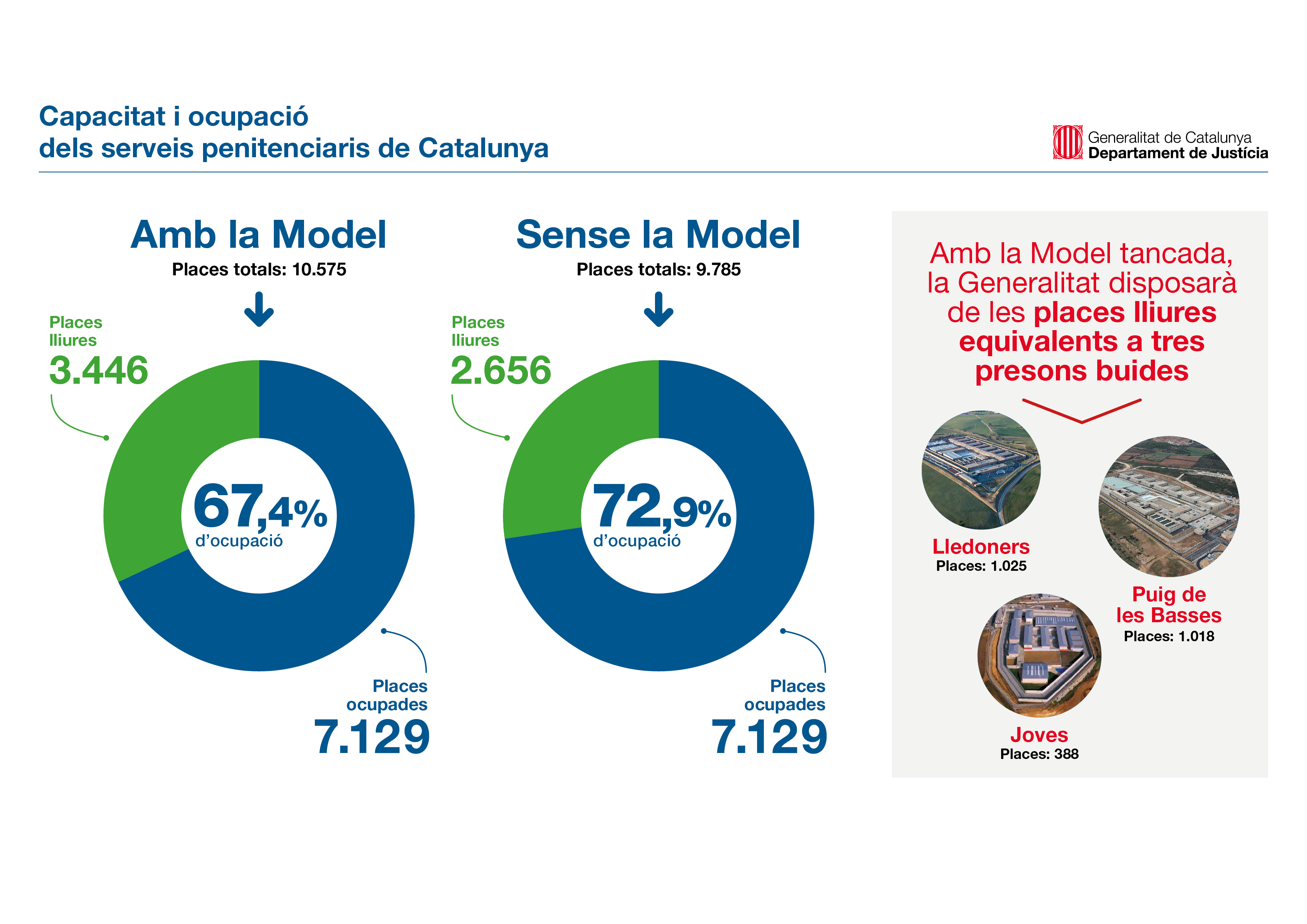 Amb el tancament de la Model, l’ocupació del conjunt dels equipaments se situarà en el 72,9 %, un 5,5 % per sobre de l’actual. La Generalitat disposarà de 2.656 places lliures, una quantitat superior a la suma dels llits de tres centres com Lledoners (1.025), Joves (388) i Puig de les Basses (1.018).