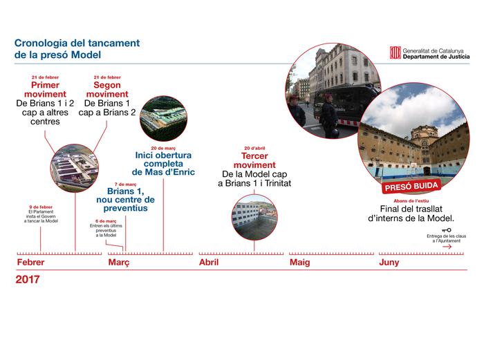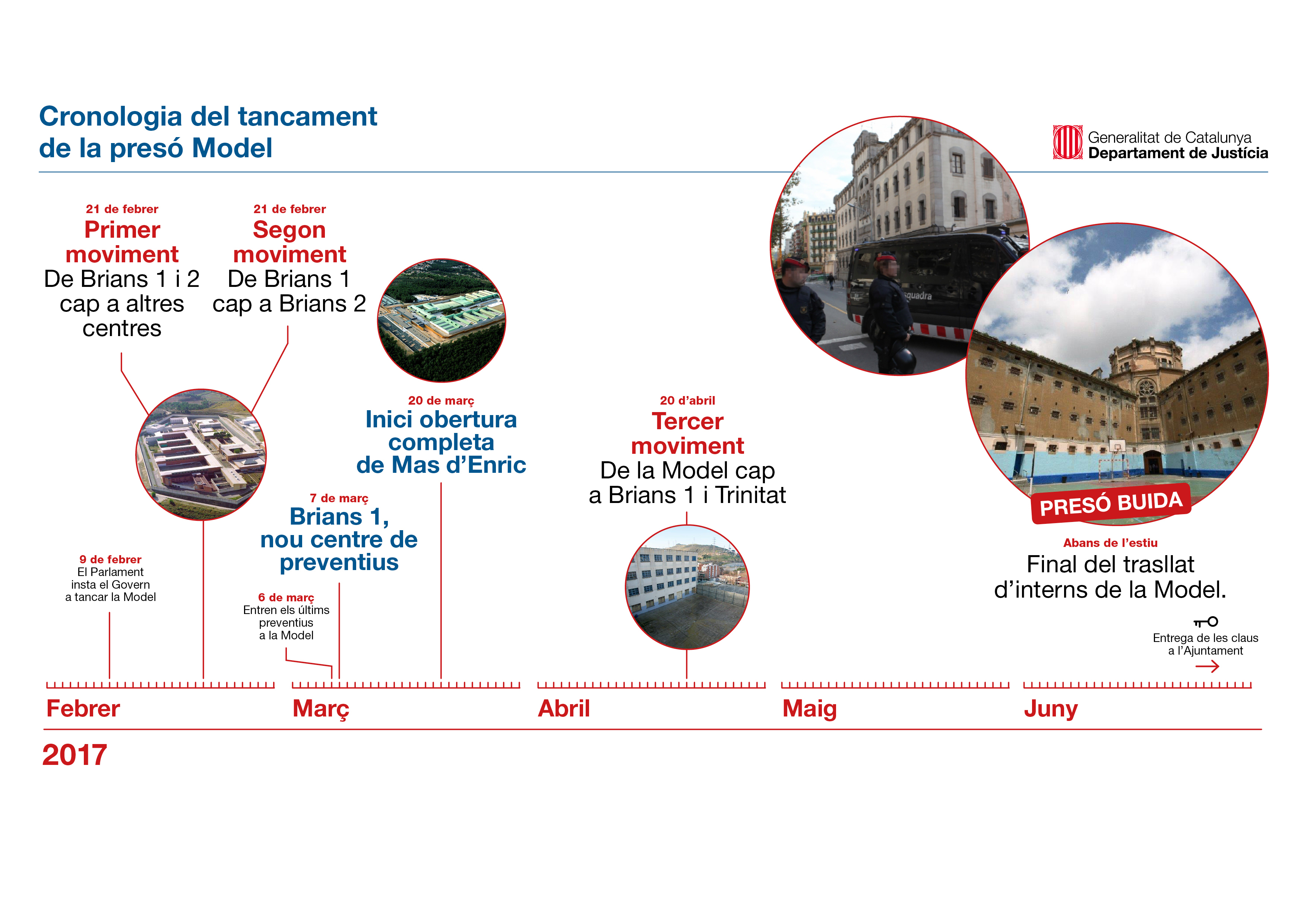 La Model té els dies comptats. La presó més antiga de Catalunya quedarà buida abans de l’estiu. Està previst que l’últim pres en surti el mes de juny. El Departament de Justícia n’entregarà les claus a l’Ajuntament aquest 2017. El Govern ha pres la decisió després d’un rigorós estudi de viabilitat i amb l’aval gairebé unànime del Parlament de Catalunya, amb 123 vots a favor i només 9 abstencions.