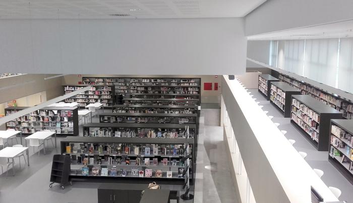 L’equipament es distribueix en una planta inferior, amb una zona infantil, una àrea de música i imatge i una àrea de diaris i revistes; una planta baixa, on hi ha la zona d’acollida i promoció, una sala polivalent i una àrea de fons general; un altell, on hi ha el fons general, l’espai multimèdia i el fons juvenil, i una planta superior en què s’ubica la zona de treball intern, el despatx de direcció, i les sales per a formació i reunions.
