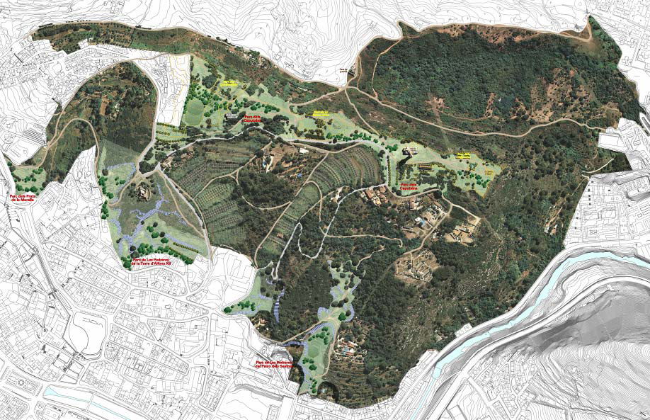 El Pla especial diferencia clarament els àmbits destinats a l’ús públic (la xarxa viària i el parc) dels àmbits d’intervenció per a la recuperació de l’espai natural i el paisatge (espais forestals, de feixes i de garriga).