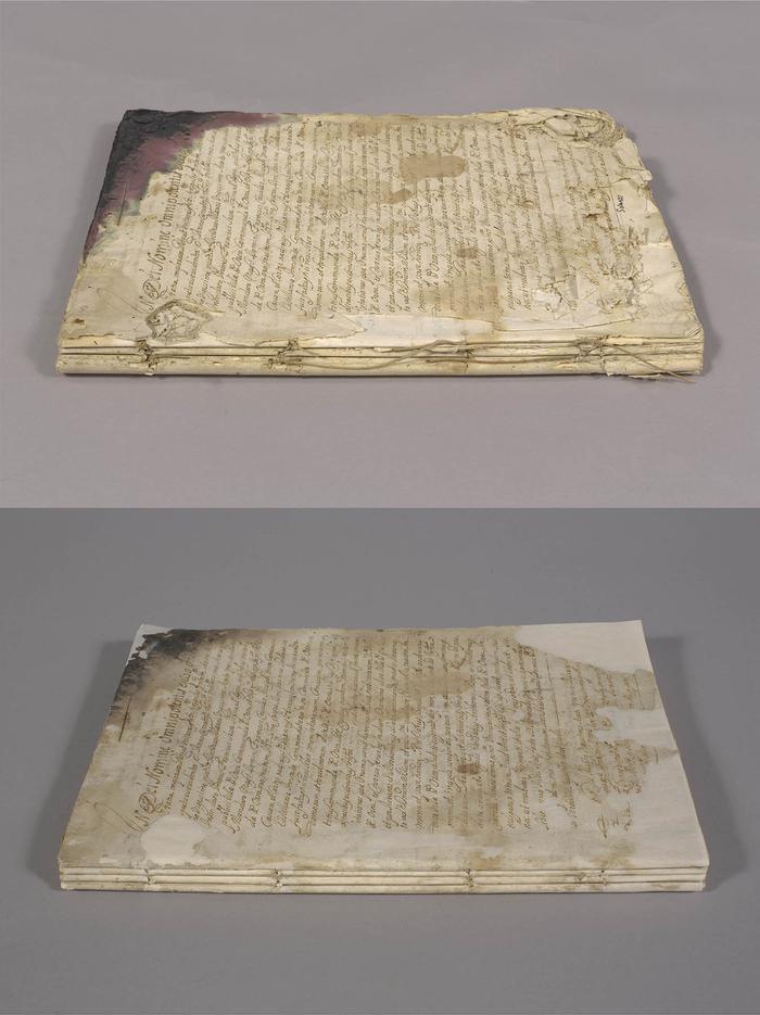 Un cop restaurats, tots els documents es presenten dins carpetes de protecció i emmagatzematge, fetes a mida i amb materials específics de conservació.