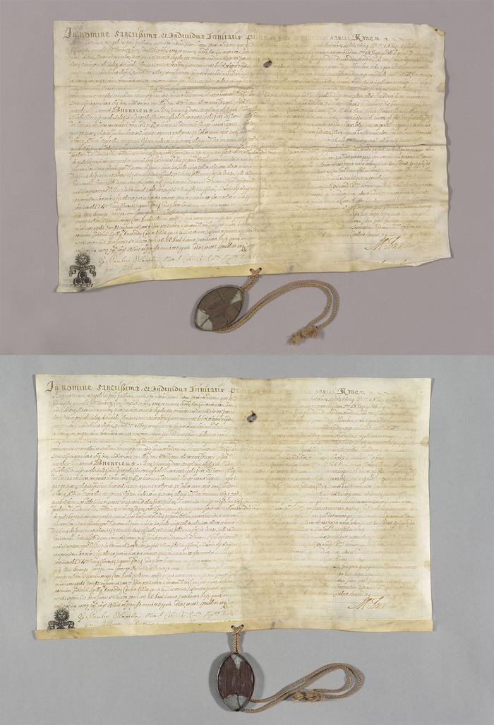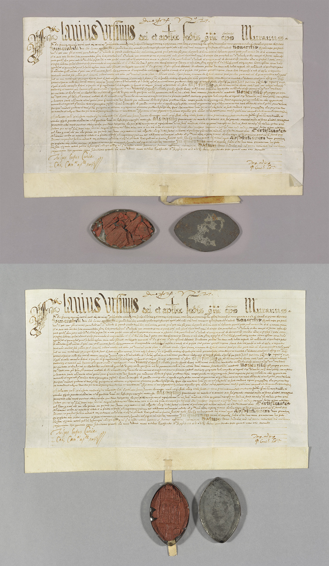 Els pergamins provenen de fons religiós. El primer, que data de l’últim quart del segle XVI i té unes dimensions de 211 x 327 mm, és una petició al degà d’Igualada perquè el prevere de Santa Coloma de Queralt pogués sortir de la presó. El segon, que data del primer quart del segle XVII, té unes dimensions de 316 x 471 mm. i és una disposició papal sobre la veneració de relíquies. Ambdós conserven els seus segells pendents, dins de una caixa de llauna estanyada.