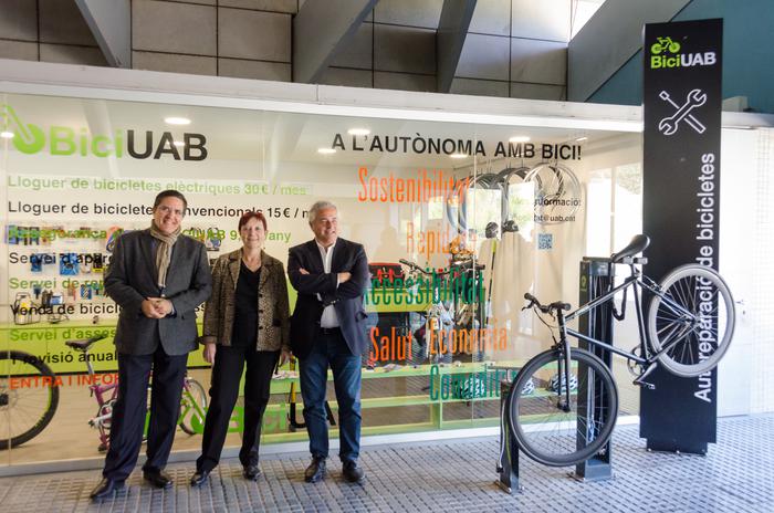 El president de Ferrocarrils de la Generalitat de Catalunya (FGC), Enric Ticó, la rectora de la Universitat Autònoma de Barcelona (UAB), Margarita Arboix, i el director de Transports i Mobilitat de l’Àrea Metropolitana de Barcelona (AMB), Joan M.Bigas, han presentat avui, 24 d'abril, el nou Servei BiciUAB, ubicat a l'estació d’FGC d’Universitat Autònoma del campus de Bellaterra, fruït de la col·laboració entre les tres entitats.