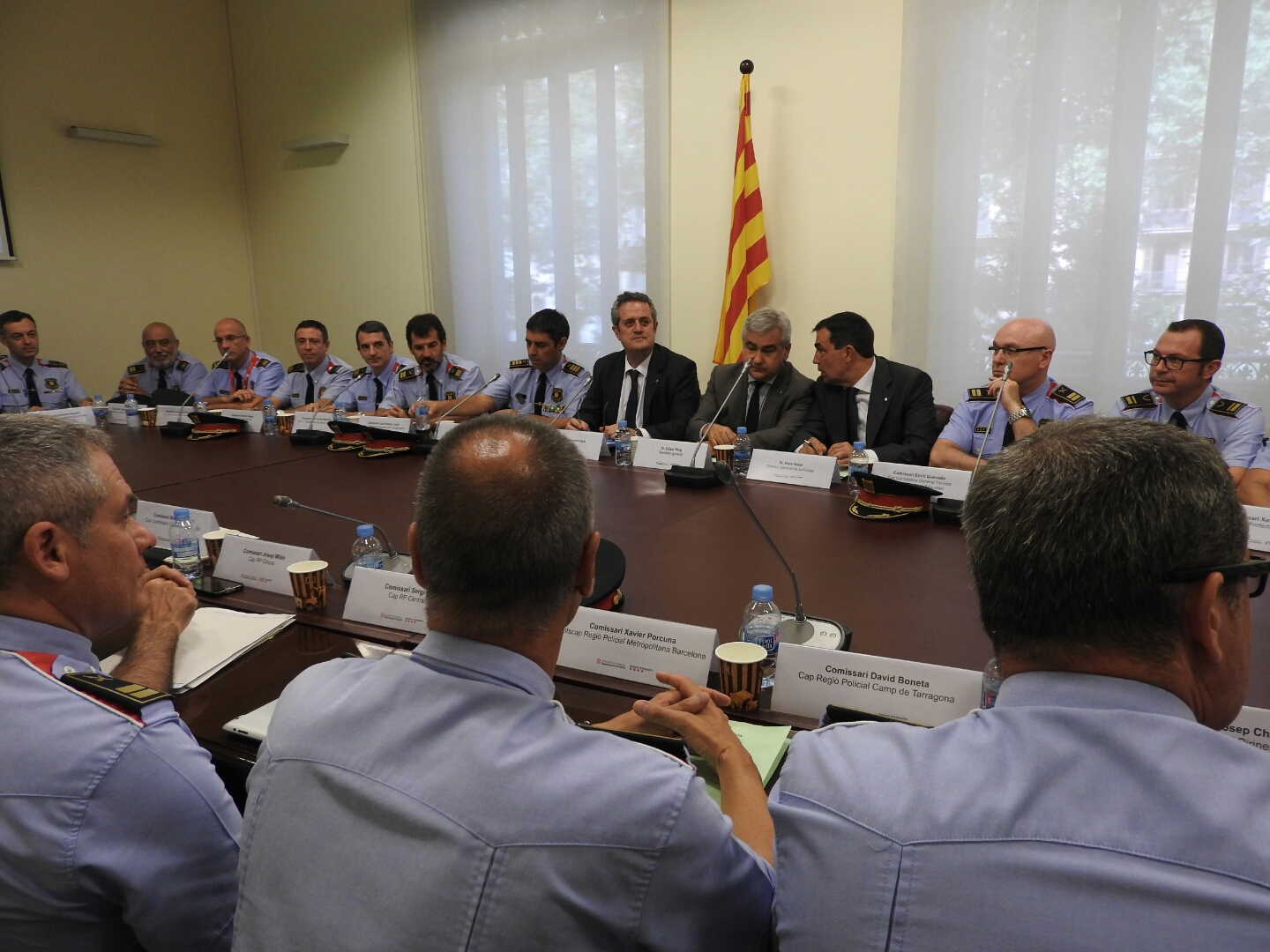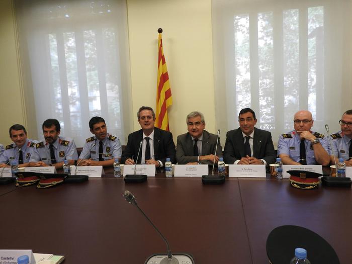 El conseller d’Interior, Joaquim Forn, ha presidit aquesta tarda la primera reunió amb els comandaments del Cos de Mossos d’Esquadra. Tot seguit Forn també ha presidit la reunió del Gabinet de Coordinació Antiterrorista amb els comandaments i màxims responsables del cos. En ambdues reunions, el conseller d’Interior ha estat acompanyat del secretari general, Cèsar Puig, i el director general de la policia, Pere Soler, i del Major del Cos dels Mossos d’Esquadra, Josep Lluís Trapero.