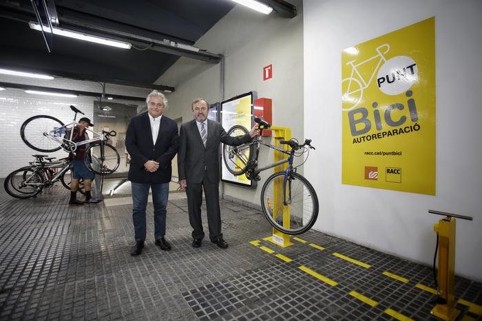 El president de Ferrocarrils de la Generalitat de Catalunya (FGC), Enric Ticó, i el president del RACC, Josep Mateu, han inaugurat avui el primer Punt Bici situat en una estació d’FGC, a l’estació de Pl. Catalunya. El conveni de col·laboració neix amb l’objectiu de promoure la intermodalitat tren-bicicleta entre els usuaris d’FGC amb la instal·lació de cinc punts d’autoreparació de bicicletes a les estacions.