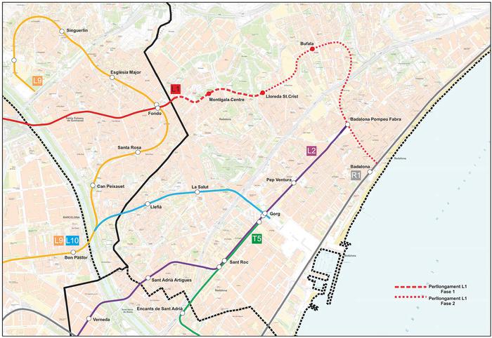 El perllongament del metro a Badalona, inclòs al Pla Director d’Infraestructures (PDI) 2011-2020, es durà a terme en dues fases. La primera inclou les dues primeres estacions i les cotxeres. El Diari Oficial de la Generalitat de Catalunya (DOGC) va publicar aquest dilluns l’estudi informatiu i d’impacte ambiental d’aquesta primera fase que el Departaments sotmet a audiència pública per un període d’1 mes. La previsió és licitar-ne el projecte constructiu la primavera de l’any 2018. Aquesta primera fase inclou l’execució d’un tram d’1,5 quilòmetres de nova línia entre pantalles, les estacions de metro als barris de Montigalà i Lloreda/Sant Crist, a més de cotxeres, tallers, nova cua de maniobres i dipòsit de trens, amb una inversió prevista de 260 milions d’euros.