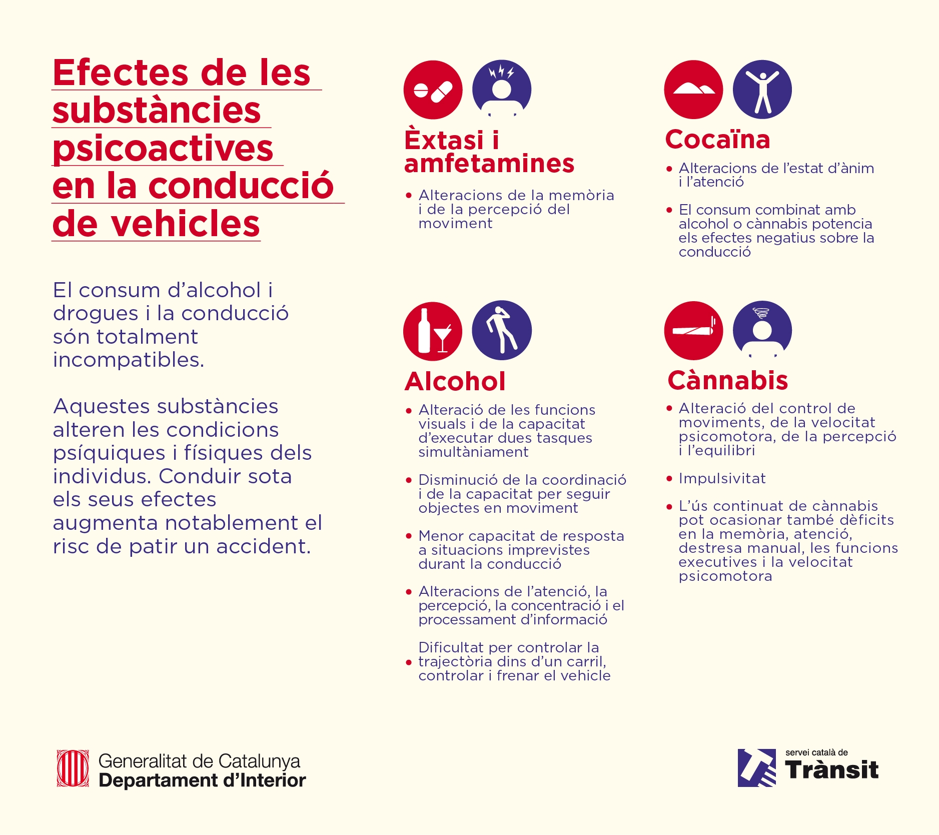 El SCT recorda que, tot i que se circuli amb una taxa d’alcoholèmia dins dels marges legals permesos, el risc d’accident pot incrementar, atès que l’única taxa segura és 0,0%. D’altra banda, el consum de substàncies psicoactives també alteren les condicions físiques i psíquiques comportant un risc greu per a la seguretat dels usuaris. La combinació en el consum d’alcohol i drogues potencia els efectes negatius sobre la conducció.