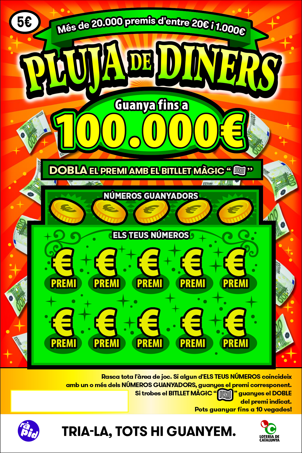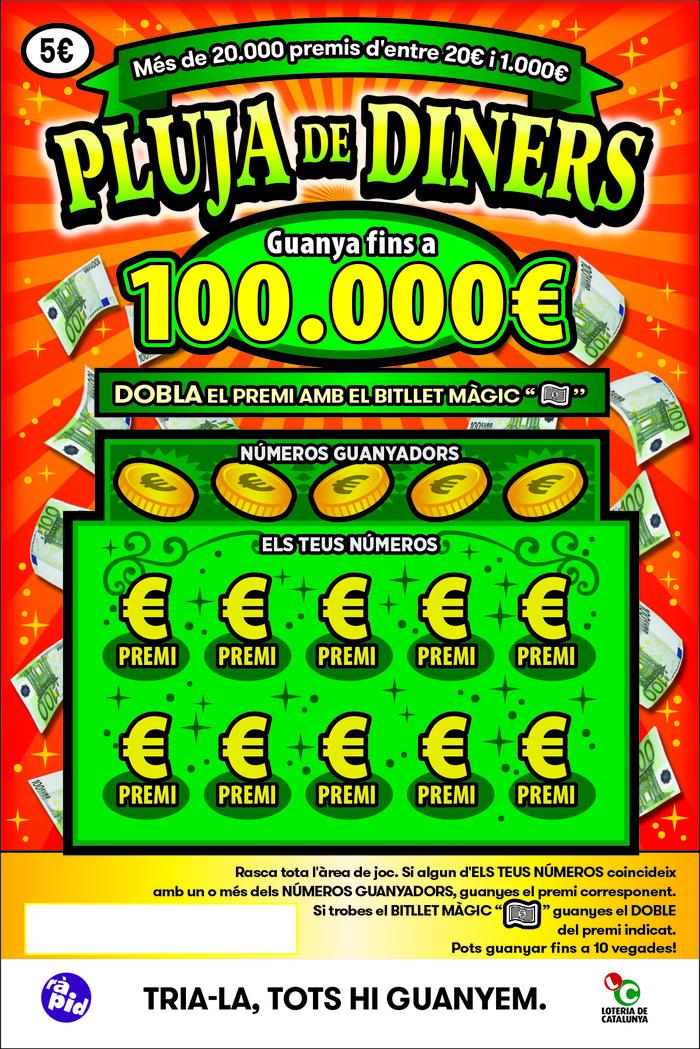 Loteria de Catalunya ha començat la distribució de “Pluja de Diners”, una nova sèrie de Loto Ràpid que a partir d’aquest dilluns, 22 de gener, es podrà comprar en qualsevol dels 2.100 punts de venda que comercialitzen els productes de Loteria de Catalunya, principalment quioscos, llibreries, bars i estancs.