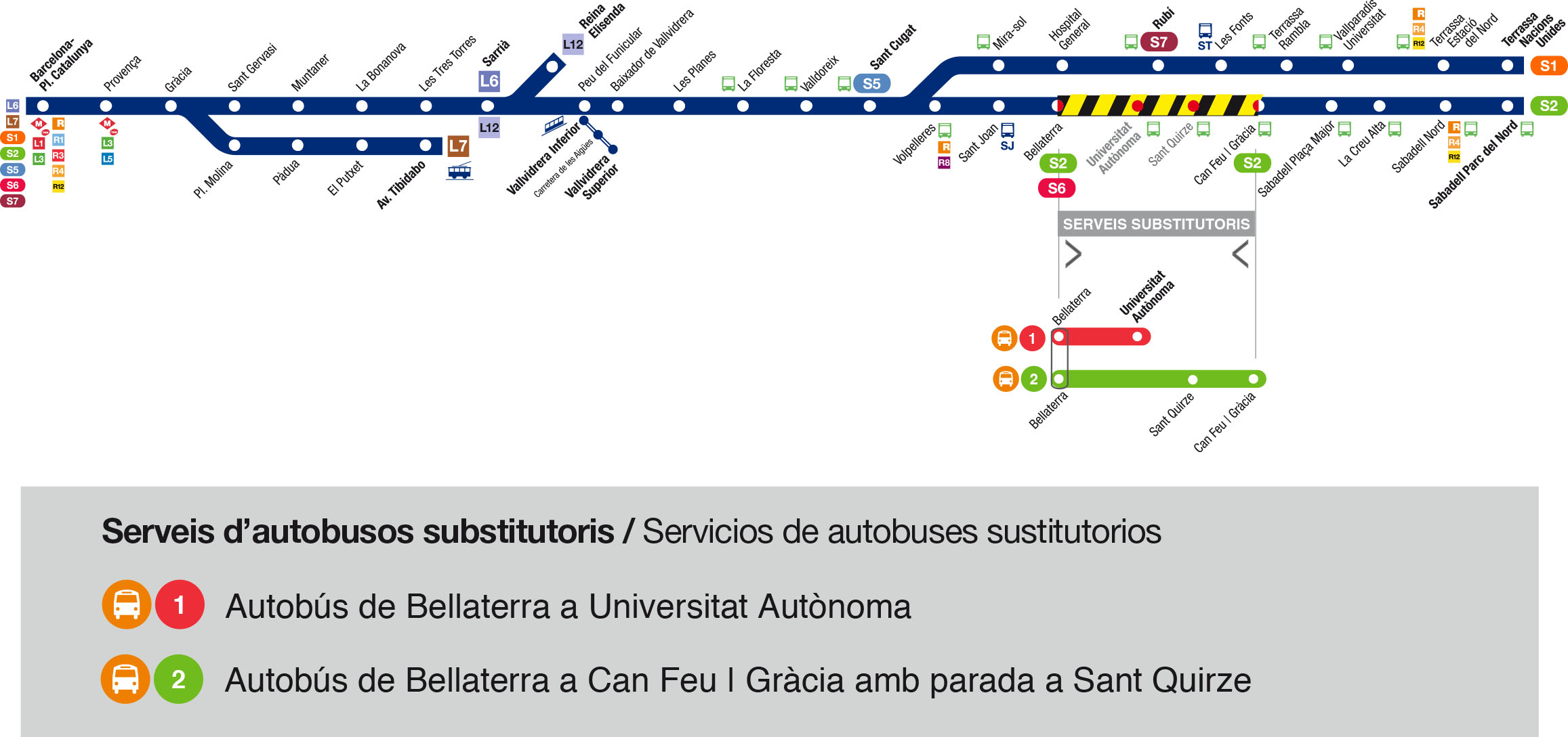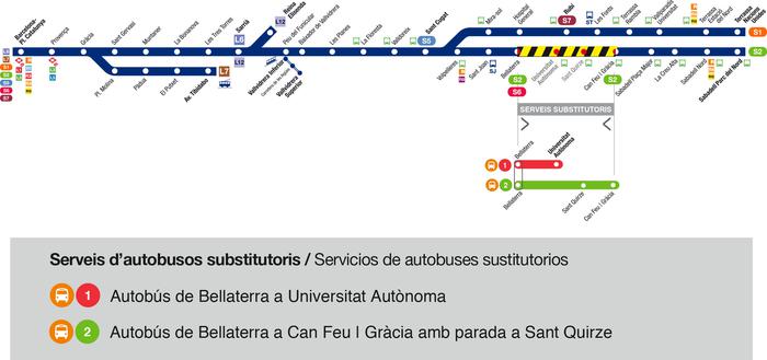 El servei substitutori amb autobús en aquest tram serà la única alteració en el servei de la línia S2 (Sabadell), és a dir, el servei ferroviari en els trams compresos entre Pl. Catalunya i Bellaterra i Can Feu | Gràcia i Sabadell Parc del Nord, funcionarà amb normalitat.