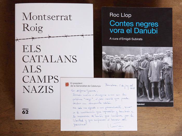 Paral·lelament a la presentació de la querella, el president Torra ha enviat a Alfonso Guerra exemplars dels llibres “Els catalans als camps nazis”, de Montserrat Roig, i “Contes negres vora el Danubi”, de Roc Llop, acompanyats d’una nota on li demana que “mai més es torni a dirigir a mi amb la paraula ‘nazi’, el pitjor insult que pugui rebre un demòcrata català”. I afegeix: “No només m’ofèn a mi personalment, sinó a la institució que represento i també a la memòria de tants que van lluitar per la llibertat i que van patir l’horror del feixisme”.