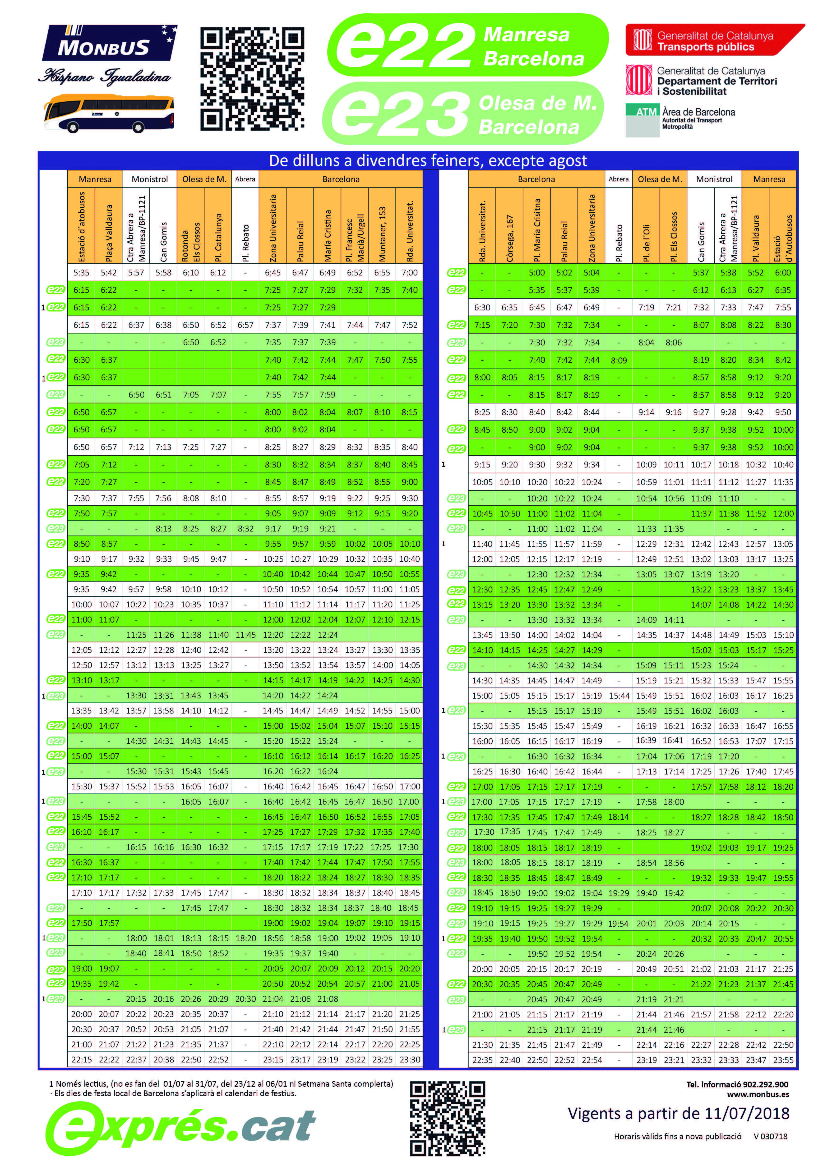 El Departament de Territori i Sostenibilitat posarà en funcionament aquest pròxim dimecres, 11 de juliol, els nous busos exprés.cat entre Manresa i Barcelona i entre Olesa i Barcelona. D’aquesta manera, l’actual línia que fa el recorregut Manresa – Monistrol de Montserrat – Olesa de Montserrat – Barcelona es desdobla en dos nous serveis d’altes prestacions per adaptar-se a les necessitats de mobilitat dels usuaris.