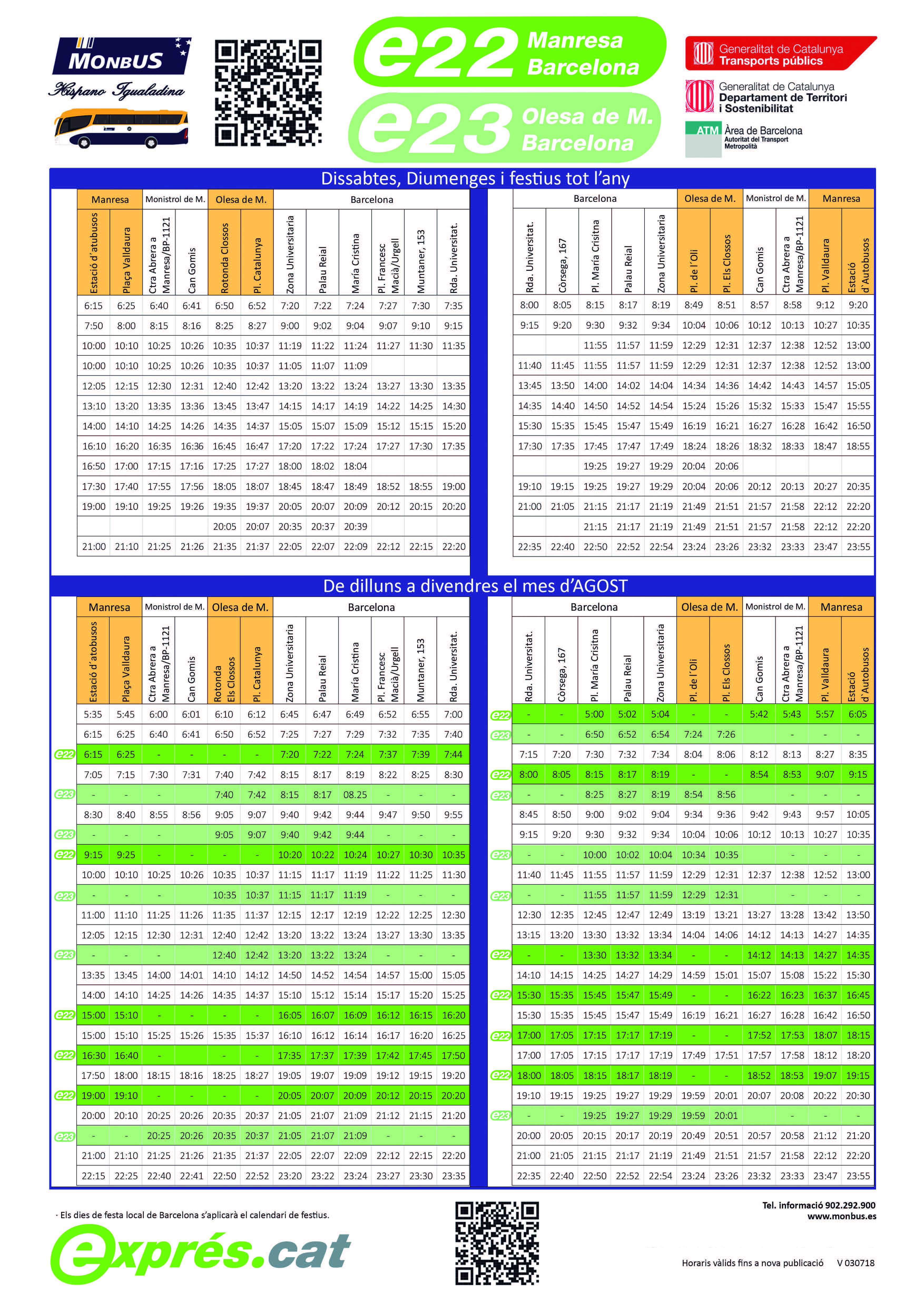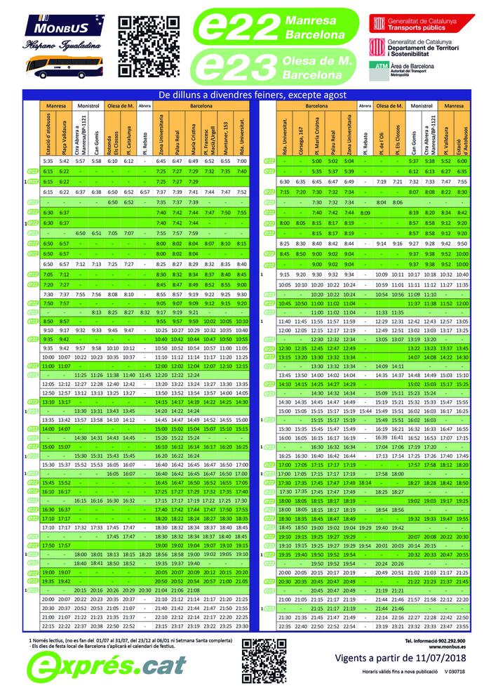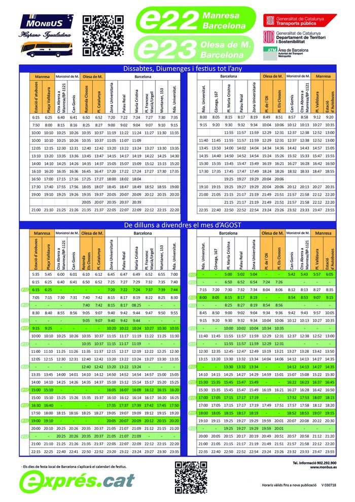 Amb la reestructuració de l’oferta dels serveis de bus en el corredor Manresa–Olesa i Barcelona s’estableixen també noves expedicions directes entre Olesa de Montserrat i Barcelona de forma que es posa en funcionament el servei exprés e23, que disposarà d’una nova oferta de serveis específicament pensada per atendre la mobilitat dels ciutadans d’Olesa de Montserrat. En aquest cas es posaran en servei 13 expedicions en sentit Barcelona, de les quals 10 sortiran de Monistrol de Montserrat per atendre la mobilitat d’aquest municipi. Hi haurà 16 expedicions en direcció a Barcelona.