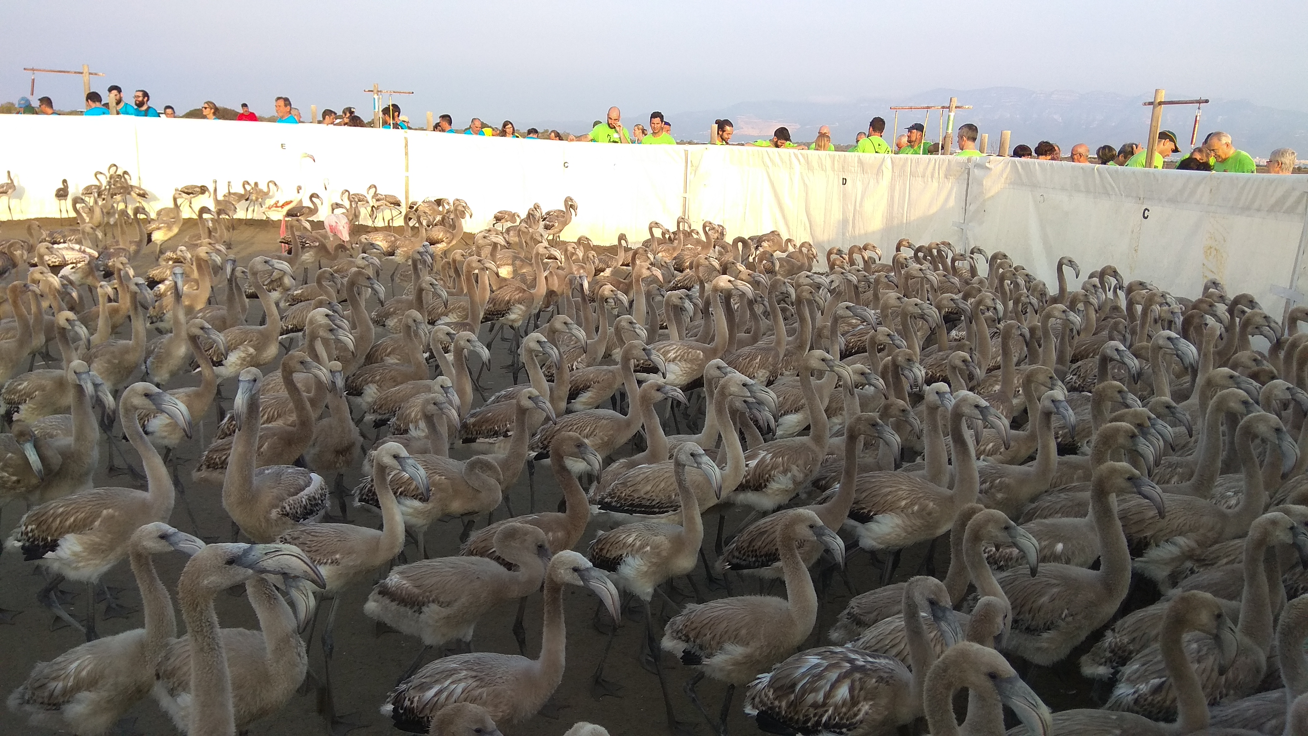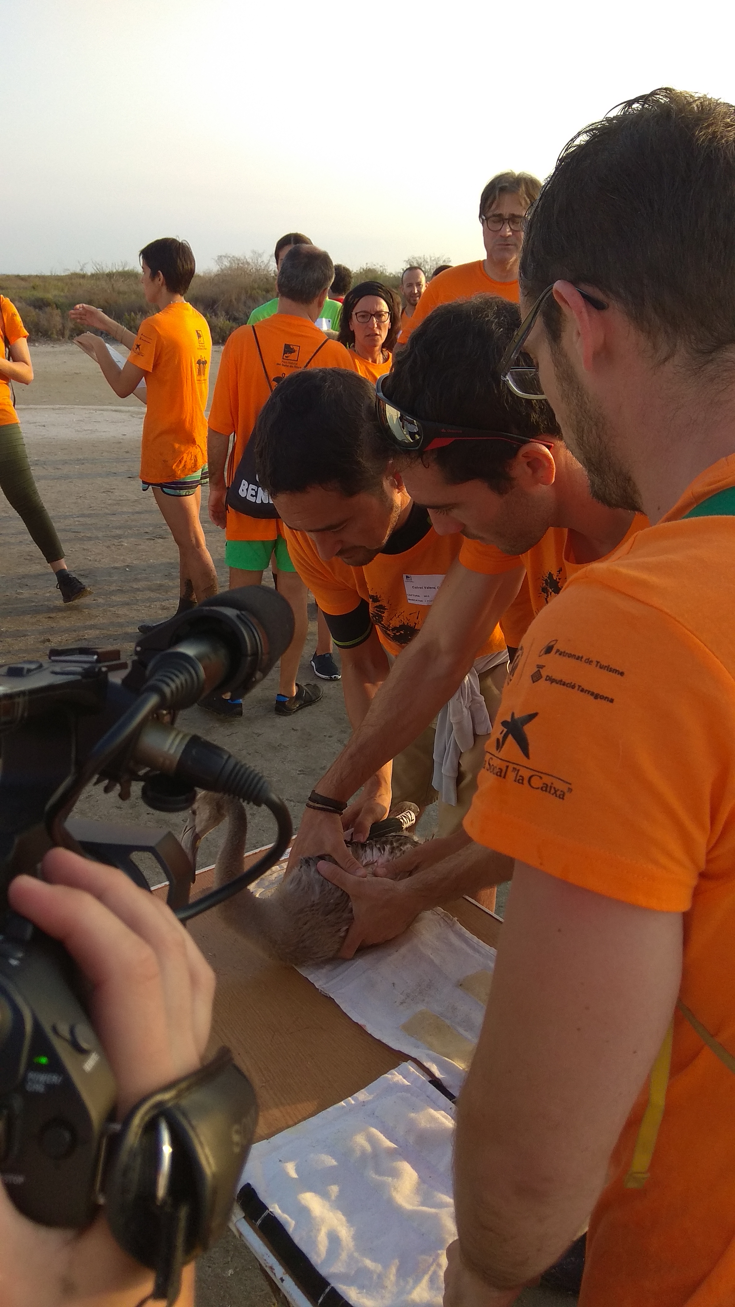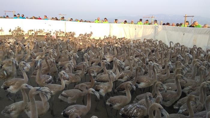 El conseller de Territori i Sostenibilitat, Damià Calvet, ha participat aquest matí en una jornada d’anellament de polls de flamenc (Phoenicopterus roseus) nascuts a la Punta de la Banya, al municipi de Sant Carles de la Ràpita (Montsià), al delta de l’Ebre. L’activitat, que es realitza per onzena edició, té per objectiu afavorir el seguiment i coneixement científic d’aquesta espècie, que només cria de tot Catalunya en aquest indret.
