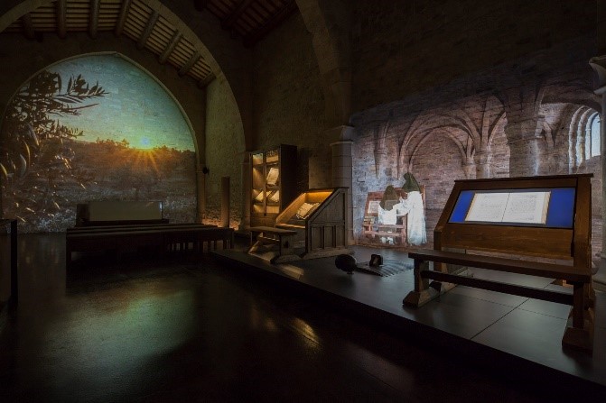 - L’scriptorium. A través d’un mapping amb personatges virtuals i d’una escenografia es recrea aquest espai per recordar com el monestir va afavorir sempre la saviesa de les monges. Des del segle XIII, Vallbona va tenir escola monacal, on rebien formació noies pertanyents a la noblesa, i un scriptorium, on un grup de monges es dedicaven a copiar i decorar els manuscrits per nodrir la biblioteca del monestir. Del fons documental que s’hi conserva destaquen llibres miniats com els que s’exposen ara per primera vegada, datats entre els segles XIII i XV, com un sacramentari cistercenc, una bíblia sacra i un còdex en el qual es recullen les cartes de Sant Bernat a la seva germana Humbelina i un gradual.