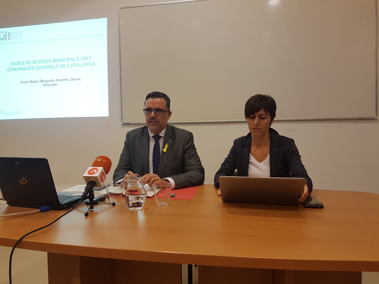 El director de l’Agència de Residus de Catalunya (ARC), Josep Maria Tost, acompanyat de la directora dels serveis territorials del Departament de Territori i Sostenibilitat a la Catalunya Central, Míriam Sort, ha presentat aquest dimecres a Manresa les dades de generació de residus municipals corresponents a l’any 2017 en l’àmbit de les comarques centrals, que abasta l’Anoia, el Bages, el Berguedà, el Moianès, Osona i el Solsonès. Segons aquest balanç, l’any passat s’hi van generar 243.600 tones de residus municipals, un 1,15% més que l’any anterior. La generació de residus per càpita s’ha situat en 1,29 kg/habitant/dia, per sota de la mitjana de Catalunya, que és d’1,40 kg/hab./dia.