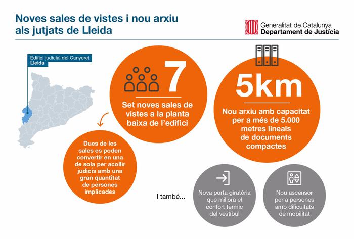 El Departament de Justícia ha construït set noves sales de vistes a la planta baixa de l’edifici judicial del Canyeret, a Lleida. Dues de les sales es poden convertir en una de sola per acollir judicis amb una gran quantitat de persones implicades. D’aquesta manera, el Canyeret concentrarà la majoria de les sales de vistes en una única planta i el ciutadà no ha de circular pels pisos superiors.